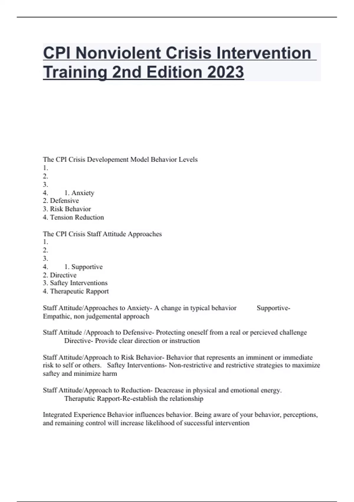 CPI Nonviolent Crisis Intervention Training 2nd Edition 2023 The CPI Crisis Developement Model Behavior Levels 1. 2. 3. 4. 1. Anxiety 2. Defensive 3. Risk Behavior 4. Tension Reduction The CPI Crisis Staff Attitude Approaches 1. 2. 3. 4. 1. Supportive 2. Directive 3. Saftey Interventions 4. Therapeutic Rapport Staff Attitude/Approaches to Anxiety- A change in typical behavior Supportive- Empathic, non judgemental approach Staff Attitude /Approach to Defensive- Protecting oneself from a real or percieved challenge Directive- Provide clear direction or instruction Staff Attitude/Approach to Risk Behavior- Behavior that represents an imminent or immediate risk to self or others. Saftey Interventions- Non-restrictive and restrictive strategies to maximize saftey and minimize harm Staff Attitude/Approach to Reduction- Deacrease in physical and emotional energy. Theraputic Rapport-Re-establish the relationship Integrated Experience Behavior influences behavior. Being aware of your behavior, perceptions, and remaining control will increase likelihood of successful intervention Percipitating Factors Factors Influencing a person's behavior. These are internal/external causes of behavior over which you little or no control. Rational Detatchment Recognizing the need to remain professional by managing your own behavior and attitude and not taking the attitude of others personally. Rational Detachment Tips 1. Take a deep breath 2. Choose your words carefully 3. Ask for help 3 Forms of Communication 1. Verbal 2. Paraverbal 3. Nonverbal Verbal Communication The words you use to send messages. Consider the significance of your words. Keep your message: -short, simple, and clear. -Respectful -Positively phrased Paraverbal Communication How you say what you say. This includes your tone, volume and rythm of speech. -Use caring, supportive tones -Keep appropriate volume to the situation -Deliver your message at a rate the person can process Nonverbal Communication Nonverbal elements include personal space, body language, communication through touch, and listening with empathy. Personal Space The distance people prefer to maintain between themsleves and others. It includes the social zone, personal zone, and intimate zone. Body Language The postures, gestures, facial expressions, and movements used to communicate. Communication Through Touch A form of physical contact that expresses feelings or emotions.