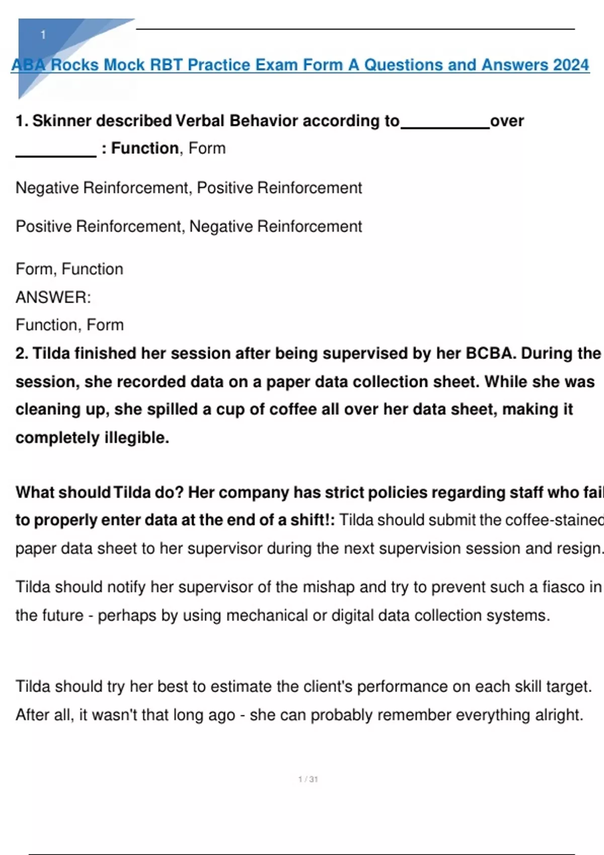 ABA Rocks Mock RBT Practice Exam Form A Questions and Answers 2024