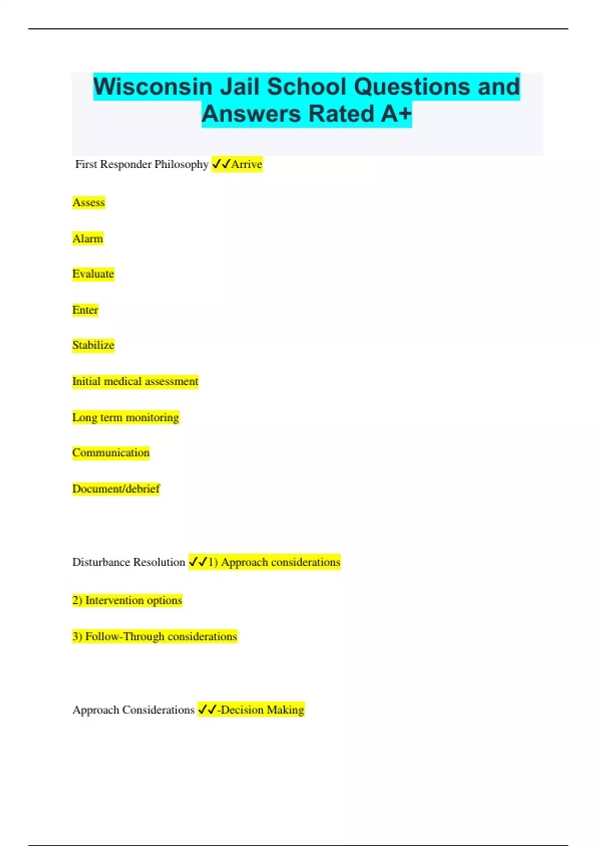 Wisconsin Jail School Questions and Answers Rated A+ First Responder Philosophy Arrive Assess Alarm Evaluate Enter Stabilize Initial medical assessment Long term monitoring Communication Document/debrief Disturbance Resolution 1) Approach considerations 2) Intervention options 3) Follow-Through considerations Approach Considerations -Decision Making -Tactical Deployment -Tactical Evaluation Intervention Options A. Presence B. Dialog C. Control Alternatives D. Protective Alternatives E. Deadly Force Follow Through Considerations 1. Stabilize 2. Monitor/Debrief 3. Search 4. Escort 5. Transport 6. Turn-over/Release Done Danger, Overriding concern, No Progress, Escape O.I.R Opening, Information Gathering, Resolution React Request cooperation, Explain reason, Allow choice, Check Decision, Take action 7 types of searches 1 Visual 2 Frisk or pat search 3 Full body search 4 Custodial search 5 Strip search 6 Body content search 7 Body cavity search Passive Resistance Non-threatening and non-compliant behavior Active Resistance Behavior which physically counteracts an officers control efforts and which creates a risk of bodily harm to the officer, subject, and/or other person Use of Force Restrictions 1 US Constitution 2 WI State Statutes 3 WI Administrative Code 4 Agency Policy and Training Deadly Force Definition The intentional use of a firearm or other instrument that creates a high probability of death or great bodily harm Deadly Force Justification Behavior which has caused or immediately threatens to cause death or great bodily harm to you or another person
