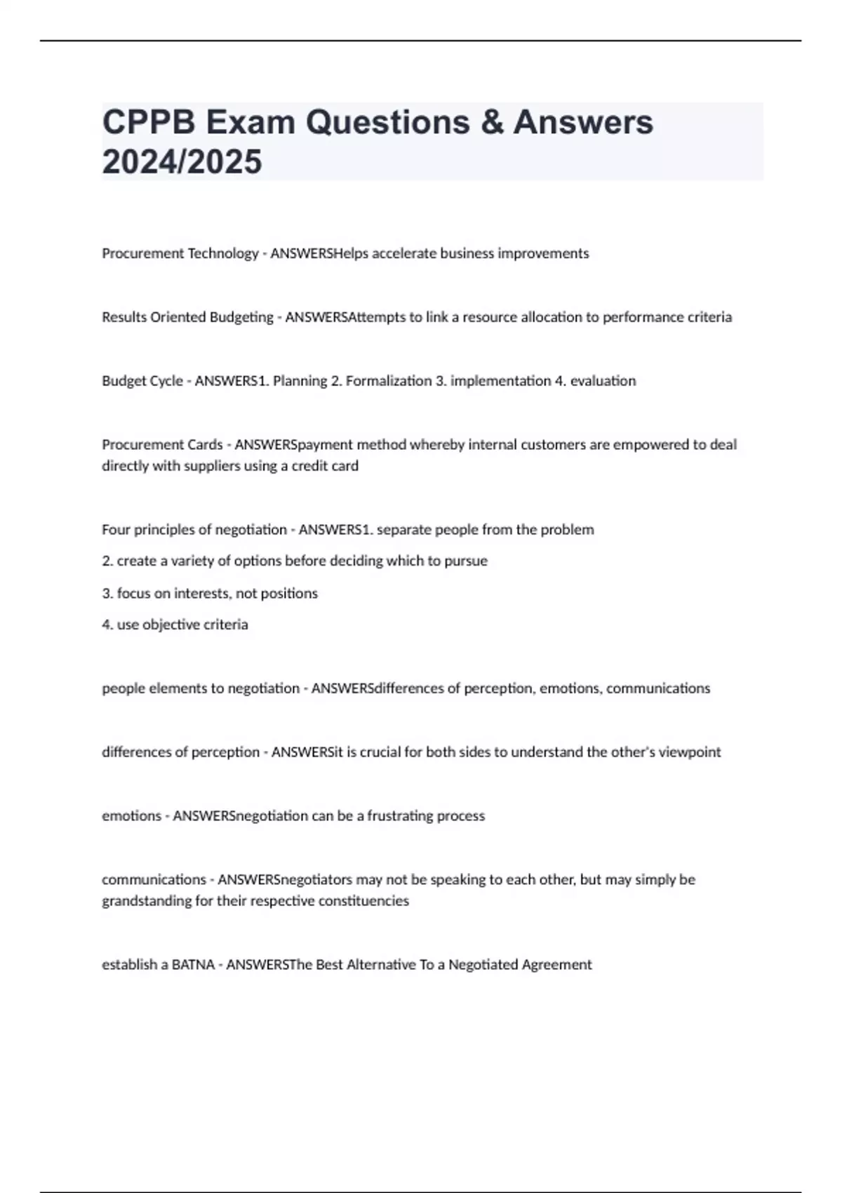 CPPB Exam Questions & Answers 2024/2025 Procurement Technology - ANSWERSHelps accelerate business improvements Results Oriented Budgeting - ANSWERSAttempts to link a resource allocation to performance criteria Budget Cycle - ANSWERS1. Planning 2. Formalization 3. implementation 4. evaluation Procurement Cards - ANSWERSpayment method whereby internal customers are empowered to deal directly with suppliers using a credit card Four principles of negotiation - ANSWERS1. separate people from the problem 2. create a variety of options before deciding which to pursue 3. focus on interests, not positions 4. use objective criteria people elements to negotiation - ANSWERSdifferences of perception, emotions, communications differences of perception - ANSWERSit is crucial for both sides to understand the other's viewpoint emotions - ANSWERSnegotiation can be a frustrating process communications - ANSWERSnegotiators may not be speaking to each other, but may simply be grandstanding for their respective constituencies establish a BATNA - ANSWERSThe Best Alternative To a Negotiated Agreement