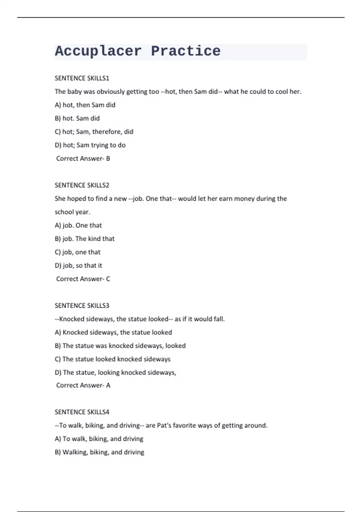 SENTENCE SKILLS1 The baby was obviously getting too --hot, then Sam did-- what he could to cool her. A) hot, then Sam did B) hot. Sam did C) hot; Sam, therefore, did D) hot; Sam trying to do Correct Answer- B SENTENCE SKILLS2 She hoped to find a new --job. One that-- would let her earn money during the school year. A) job. One that B) job. The kind that C) job, one that D) job, so that it Correct Answer- C SENTENCE SKILLS3 --Knocked sideways, the statue looked-- as if it would fall. A) Knocked sideways, the statue looked B) The statue was knocked sideways, looked C) The statue looked knocked sideways D) The statue, looking knocked sideways, Correct Answer- A SENTENCE SKILLS4 --To walk, biking, and driving-- are Pat's favorite ways of getting around. A) To walk, biking, and driving B) Walking, biking, and driving C) To walk, biking, and to drive D) To walk, to bike, and also driving Correct Answer- B SENTENCE SKILLS5 --When you cross the street in the midle of the block, this-- is an example of jaywalking. A) When you cross the street in the middle of the block, this B) You cross the street in the middle of the block, this C) Crossing the street in the middle of the block D) The fact that you cross the street in the middle of the block Correct Answer- C SENTENCE SKILLS6 Walking by the corner the other day, --a child, I noticed, was watching-- for the light to change. A) a child, I noticed, was B) I noticed a child watching C) a child was watching, I noticed, D) there was, I noticed, a child watching Correct Answer- B SENTENCE SKILLS7 In his songs, Gordon Lightfoot makes melody and lyrics intricately intertwine. Rewrite, beginning with --Melody and lyrics-- Your new sentence will include A) Gordon Lightfoot has B) make Gordon Lightfoot's C) in Gordon Lightfoot's D) does Gordon Lightfood Correct Answer- C SENTENCE