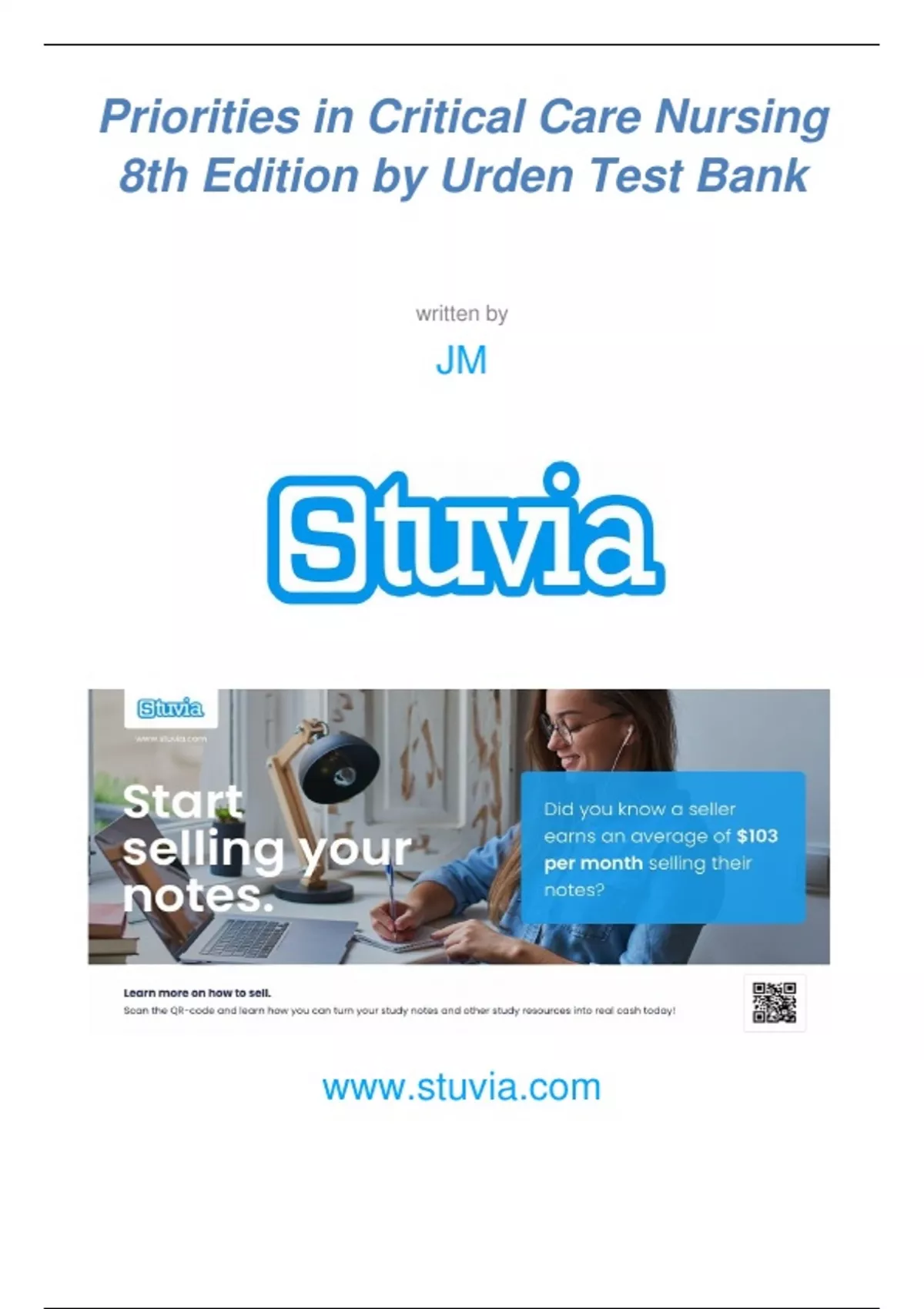 Priorities in Critical Care Nursing 8th Edition by Urden Test Bank written by JM www.stuvia.com P a g e 2 | 295 2 Chapter 01: Caring for the Critically Ill Patient Urden: Priorities in Critical Care Nursing, 8th Edition MULTIPLE CHOICE 1. What type of practitioner has a broad depth of specialty knowledge and expertise and manages complex clinical and system issues? a. Registered nurses b. Advanced practice nurses c. Clinical nurse leaders d. Intensivists ANS: B Advanced practice nurses (APNs) have a broad depth of knowledge and expertise in their specialty area and manage complex clinical and systems issues. Intensivists are medical practitioners who manage the critical ill patient. Registered nurses (RNs) are generally direct care providers. Clinical nurse leaders (CNLs) generally do not manage system issues. PTS: 1 DIF: Cognitive Level: Remembering OBJ: Nursing Process Step: N/A TOP: Caring for the Critically Ill Patient MSC: NCLEX: Safe and Effective Care Environment: Coordinated Care 2. What type of practitioner is instrumental in ensuring care that is evidence based and that safety programs are in place? a. Clinical nurse specialist b. Advanced practice nurse c. Registered nurses d. Nurse practitioners ANS: A Clinical nurse specialists (CNSs) serve in specialty roles that use their clinical, teaching, research, leadership, and consultative abilities. They are instrumental in ensuring that care is evidence based and that safety programs are in place. Advanced practice nurses (APNs) have a broad depth of knowledge and expertise in their specialty area and manage complex clinical and systems issues. Registered nurses are generally direct care providers. Nurse practitioners (NPs) manage direct clinical care of groups of patients. PTS: 1 DIF: Cognitive Level: Remembering OBJ: Nursing Process Step: N/A TOP: Caring for the Critically Ill Patient MSC: NCLEX: Safe and Effective Care Environment: Coordinated Care 3. Which professional organization administers critical care certification exams for registered nurses? a. State Board of Registered Nurses b. National Association of Clinical Nurse Specialist c. Society of Critical Care Medicine P a g e 3 | 295 3 d. American Association of Critical -Care Nurses ANS:D American Association of Critical -Care Nurses (AACN) administers certification exams for registered nurses. The State Board of Registered Nurses (SBON) does not administer certification exams. National Association of Clinical Nurse Specialists (NACNS) does not administer certification exams. Society of Critical Care Medicine (SCCM) does not administer nursing certification exams for registered nurses. PTS: 1 DIF: Cognitive Level: Remembering OBJ: Nursing Process Step: N/A TOP: Caring for the Critically Ill Patient MSC: NCLEX: Safe and Effective Care Environment: Coordinated Care 4. The American Association of Critical -Care Nurses (AACN) has developed short directives that can be used as quick references for clinical use that are known as: a. critical care protocol. b. practice policies. c. evidence -based research. d. practice alerts. ANS: D The American Association of Critical -Care Nurses (AACN) has promulgated several evidence -based practice summaries in the form of “practice alerts.” Evidence -based nursing practice considers the best research evidence on the care topic along with clinical expertise of the nurse and patient preferences. Critical care protocol and practice policies are established by individual institutions. PTS: 1 DIF: Cognitive Level: Remembering OBJ: Nursing Process Step: Planning TOP: Caring for the Critically Ill Patient MSC: NCLEX: Safe and Effective Care Environment: Coordinated Care P a g e 4 | 295 4 5. What type of therapy is an option to conventional treatment? a. Alternative b. Holistic c. Complementary d. Individualized ANS: A The term alternative denotes that a specific therapy is an option or alternative to what is considered conventional treatment of a condition or state. The term complementary was proposed to describe therapies that can be used to complement or support conventional treatments. Holistic care focuses on human integrity and stresses that the body, mind, and spirit are interdependent and inseparable. Individualized care recognizes the uniqueness of each patient’s preferences, condition, and physiologic and psychosocial status. PTS: 1 DIF: Cognitive Level: Remembering OBJ: Nursing Process Step: Implementation TOP: Caring for the Critically Ill Patient MSC: NCLEX: Physiological Integrity: Basic Care and Comfort 6. Guided imagery and massage are both examples of what type of treatment? a. Alternative therapy b. Holistic care c. Complementary care d. Individualized care ANS: C The term complementary was proposed to describe therapies that can be used to complement or support conventional treatments. Guided imagery, massage, and animal -assisted therapy are all examples of complementary care. The term alternative denotes that a specific therapy is an option or alternative to what is considered conventional treatment of a condition or state. Holistic care focuses on human integrity and stresses that the body, mind, and spirit are interdependent and inseparable. Individualized care recognizes the uniqueness of each patient’s preferences, condition, and physiologic and psychosocial status. PTS: 1 DIF: Cognitive Level: Understanding OBJ: Nursing Process Step: Implementation TOP: Caring for the Critically Ill Patient MSC: NCLEX: Physiological Integrity: Basic Care and Comfort 7. A patient was admitted to a rural critical care unit in Montana. Critical care nurses are assisting with monitoring and care of the patient from the closest major city. What is this type of practice termed? a. Tele-nursing b. Tele-ICU c. Tele-informatics d. Tele-hospital ANS: B Tele-ICU is a form of telemedicine. Telemedicine was initially used in outpatient areas, remote rural geographic locations, and areas where there was a dearth of medical providers. Currentl