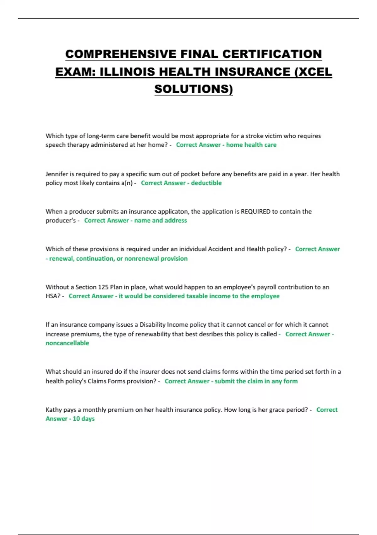 COMPREHENSIVE FINAL CERTIFICATION EXAM: ILLINOIS HEALTH INSURANCE (XCEL SOLUTIONS)