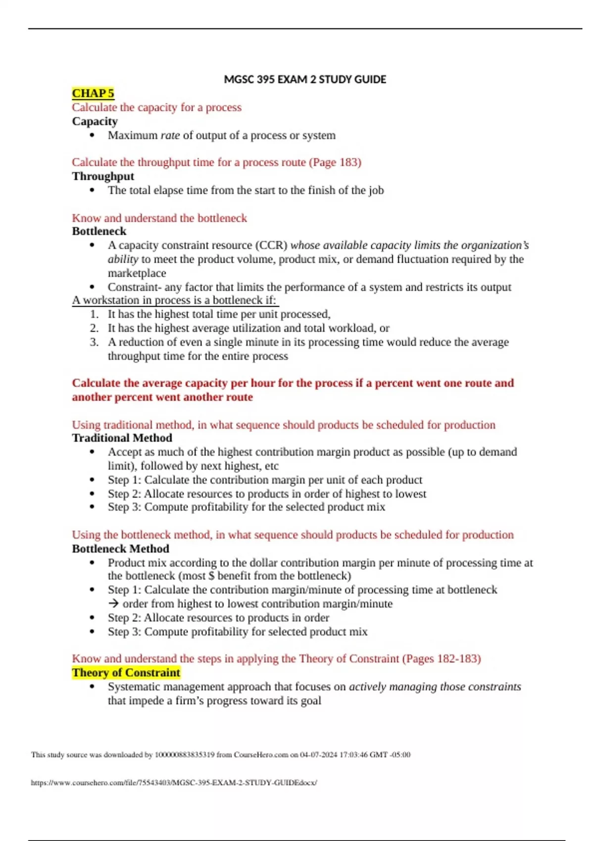 MGSC 395 EXAM 2 STUDY GUIDE CHAP 5 Calculate the capacity for a process Capacity Maximum rate of output of a process or system Calculate the throughput time for a process route (Page 183) Throughput The total elapse time from the start to the finish of the job Know and understand the bottleneck Bottleneck A capacity constraint resource (CCR) whose available capacity limits the organization’s ability to meet the product volume, product mix, or demand fluctuation required by the marketplace Constraint- any factor that limits the performance of a system and restricts its output A workstation in process is a bottleneck if: 1. It has the highest total time per unit processed, 2. It has the highest average utilization and total workload, or 3. A reduction of even a single minute in its processing time would reduce the average throughput time for the entire process Calculate the average capacity per hour for the process if a percent went one route and another percent went another route Using traditional method, in
