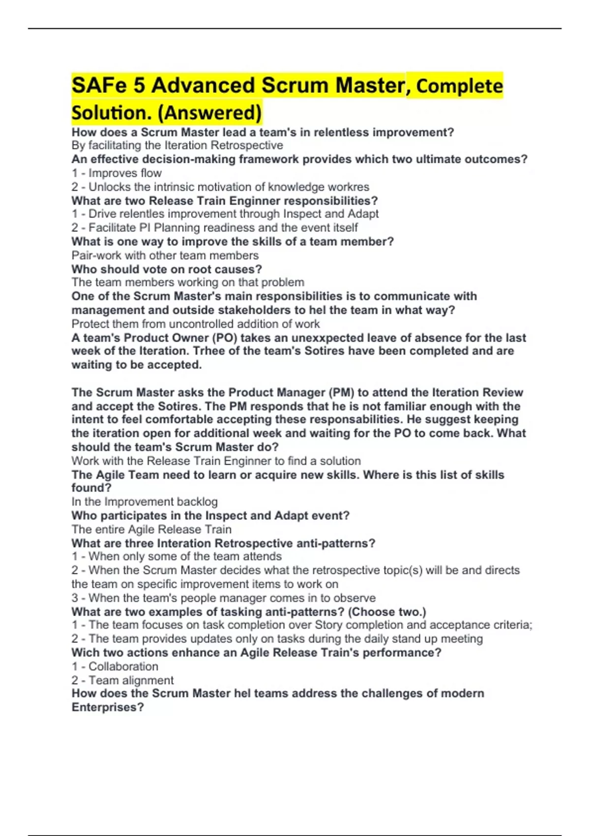 SAFe 5 Advanced Scrum Master, Complete Solution. (Answered) How does a Scrum Master lead a team's in relentless improvement? By facilitating the Iteration Retrospective An effective decision-making framework provides which two ultimate outcomes? 1 - Improves flow 2 - Unlocks the intrinsic motivation of knowledge workres What are two Release Train Enginner responsibilities? 1 - Drive relentles improvement through Inspect and Adapt 2 - Facilitate PI Planning readiness and the event itself What is one way to improve the skills of a team member? Pair-work with other team members Who should vote on root causes? The team members working on that problem One of the Scrum Master's main responsibilities is to communicate with management and outside stakeholders to hel the team in what way? Protect them from uncontrolled addition of work A team's Product Owner (PO) takes an unexxpected leave of absence for the last week of the Iteration. Trhee of the team's Sotires have been completed and are waiting to be accepted. The Scrum Master asks the Product Manager (PM) to attend the Iteration Review and accept the Sotires. The PM responds that he is not familiar enough with the intent to feel comfortable accepting these responsabilities. He suggest keeping the iteration open for additional week and waiting for the PO to come back. What should the team's Scrum Master do? Work with the Release Train Enginner to find a solution The Agile Team need to learn or acquire new skills. Where is this list of skills found? In the Improvement backlog Who participates in the Inspect and Adapt event? The entire Agile Release Train What are three Interation Retrospective anti-patterns? 1 - When only some of the team attends 2 - When the Scrum Master decides what the retrospective topic(s) will be and directs the team on specific improvement items to work on 3 - When the team's people manager comes in to observe What are two examples of tasking anti-patterns? (Choose two.) 1 - The team focuses on task completion over Story completion and acceptance criteria; 2 - The team provides updates only on tasks during the daily stand up meeting Wich two actions enhance an Agile Release Train's performance? 1 - Collaboration 2 - Team alignment How does the Scrum Master hel teams address the challenges of modern Enterprises? By actively addressing impediments What is the skill type Scrum Masters try to get the Agile Team to achieve? T-Shaped One state on the team Kaban board has people waiting while the previous stage is overloaded. What should the Scrum Master consider doing? Encourage and coach the people in the under-utilized stage to hel with the work of the overloaded stage How can learning Milestones be used? To test the conecpt of a new Feature or Capability What is one Extreme Programming (XP) rule adopted in SAFe? Pair Programming Why are SAFe Scrum Masters challenged differently in a Enterprise? The team is affected by teams and stakeholders beyong their control SAFe Scrum Master interact with wich level(s) of Framework? All Levels Wich tow events explicity implement the Lean-Agile Mindset of relentless improvement? 1 - Inspect and Adapt 2 - Iteration Retrospective Who is responsible for assisting to establish Continuous Integration in SAFe? The System Team What is the connection between feedback and optimun batch size? Lack of feedback contributes to higher cost During Iteration Review, the team decides to carry forward three Stories to the next iteration. This is the second time during this PI that some of the team's Stories are carried over. What are two actions the Scrum Master should take? 1 - Discuss the issue at the Itaration Retrospective 2 - Perform the 5 Whys to find the root cause of the delays Who reviews the top Capabilities for the upcoming PI? Solution Management Wich statement describes how Kanban teams handle capacity during PI Planning? They use throughput as an indication of their capacity Which technique is used to identify root causes during the problem-solving workshop? 5 Whys What are two key areas a team should be organized aroung? 1 - Enablers 2 - Features What anti-pattern can emerge during the Scrum of Scrums? Scrum Masters report on the teams' tasks status each day A team achieved less than 80% predictability during the quantitative measurement of the Inspect and Adapt event. What would be an unacceptable action for this team's Scrum Master take? Decide improvement actions for the team to implement In complex systems development, what do local integration points ensure? That each Capability of the systems is meeting its responsibilities in contributing of the overall Solution Intent Wich SAFe organizational construct allows businesses to build large and complex systems wich require hundreds of people in a Lean-Agile manner? Solution Train Achieving the goals of Release on Demand requires an understanding of how to decouple what? The release from deployment What improves collaboration between Scrum Masters and System Architects, System Teams and Operations? Program Kanban What is the most effective way to estabilish Built-in Quality? Perform as many types of testing within the Iteration boundaries as possible What action should be taken on relentless improvement backlog items from the problem-solving worshop? Use the items as direct input into the PI Planning event that follows How do Kanban Teams implement the SAFe Lean-Agile mindset of relentless improvement? By using cumulative flow diagrams to objectively measure bottlenecks and variation which could be due to systemic factors Wich SAFe configuration requires having a Vision? All SAFe configurations What are two typical anti-patterns with Product Owners (POs)? 1 - POs design the Solution before brining the intent to the team; 2 - POs and Product Management are not aligned with business intent What is a recommended Story-Splitting technique for Agile Teams? Implement the 'happy path' first and the rest of the scenarios afterwards What is the fi
