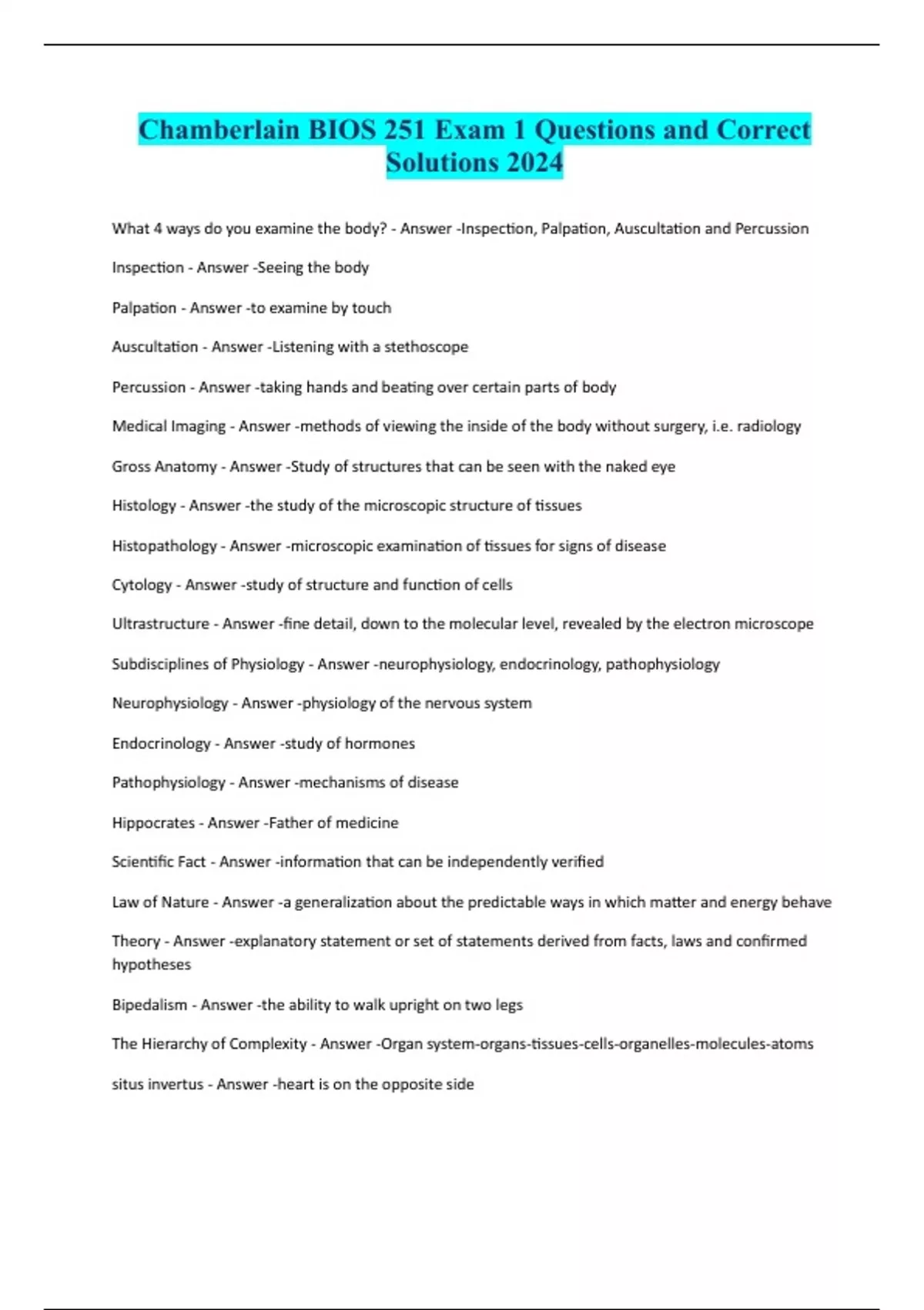 Chamberlain BIOS 251 Exam 1 Questions and Correct Solutions 2024 What 4 ways do you examine the body? - Answer -Inspection, Palpation, Auscultation and Percussion Inspection - Answer -Seeing the body Palpation - Answer -to examine by touch Auscultation - Answer -Listening with a stethoscope Percussion - Answer -taking hands and beating over certain parts of body Medical Imaging - Answer -methods of viewing the inside of the body without surgery, i.e. radiology Gross Anatomy - Answer -Study of structures that can be seen with the naked eye Histology - Answer -the study of the microscopic structure of tissues Histopathology - Answer -microscopic examination of tissues for signs of disease Cytology - Answer -study of structure and function of cells Ultrastructure - Answer -fine detail, down to the molecular level, revealed by the electron microscope Subdisciplines of Physiology - Answer -neurophysiology, endocrinology, pathophysiology Neurophysiology - Answer -physiology of the nervous system Endocrinology - Answer -study of hormones Pathophysiology - Answer -mechanisms of disease Hippocrates - Answer -Father of medicine Scientific Fact - Answer -information that can be independently verified Law of Nature - Answer -a generalization about the predictable ways in which matter and energy behave Theory - Answer -explanatory statement or set of statements derived from facts, laws and confirmed hypotheses Bipedalism - Answer -the ability to walk upright on two legs The Hierarchy of Complexity - Answer -Organ system-organs-tissues-cells-organelles-molecules-atoms situs invertus - Answer -heart is on the opposite side