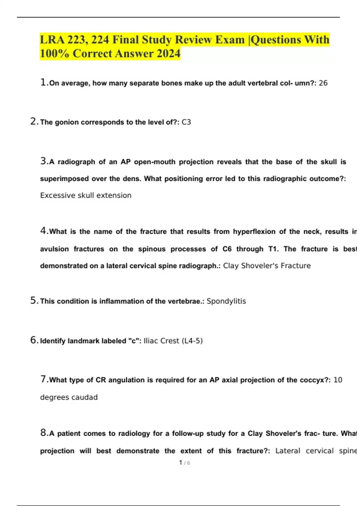 LRA 223, 224 Final Study Review Exam |Questions With 100% Correct Answer 2024 1. On average, how many separate bones make up the adult vertebral col- umn?: 26 2. The gonion corresponds to the level of?: C3 3. A radiograph of an AP open-mouth projection reveals that the base of the skull is superimposed over the dens. What positioning error led to this radiographic outcome?: Excessive skull extension 4. What is the name of the fracture that results from hyperflexion of the neck, results in avulsion fractures on the spinous processes of C6 through T1. The fracture is best demonstrated on a lateral cervical spine radiograph.: Clay Shoveler's Fracture 5. This condition is inflammation of the vertebrae.: Spondylitis 6. Identify landmark labeled "c": Iliac Crest (L4-5) 7. What type of CR angulation is required for an AP axial projection of the coccyx?: 10 degrees caudad 8. A patient comes to radiology for a follow-up study for a Clay Shoveler's frac- ture. What projection will best demonstrate the extent of this fracture?: Lateral cervical spine projection 9. Which specific aspect of the sacrum articulates with the ilium to form the sacroiliac joints?: Auricular surface 10. Identify the projection on this radiograph.: AP axial sacrum 11. A radiograph of a lateral projection of the lumbar spine reveals that the mid-to lower-intervertebral joint spaces are not open. The patient's waist was supported. Which modifications will help open joint spaces during the repeat exposure?: Increase waist support and/or angle CR 5 to 8 degrees caudal. 12. A radiograph of an AP open-mouth projection of the cervical spine reveals that the zygapophyseal joints are not symmetric. No fracture