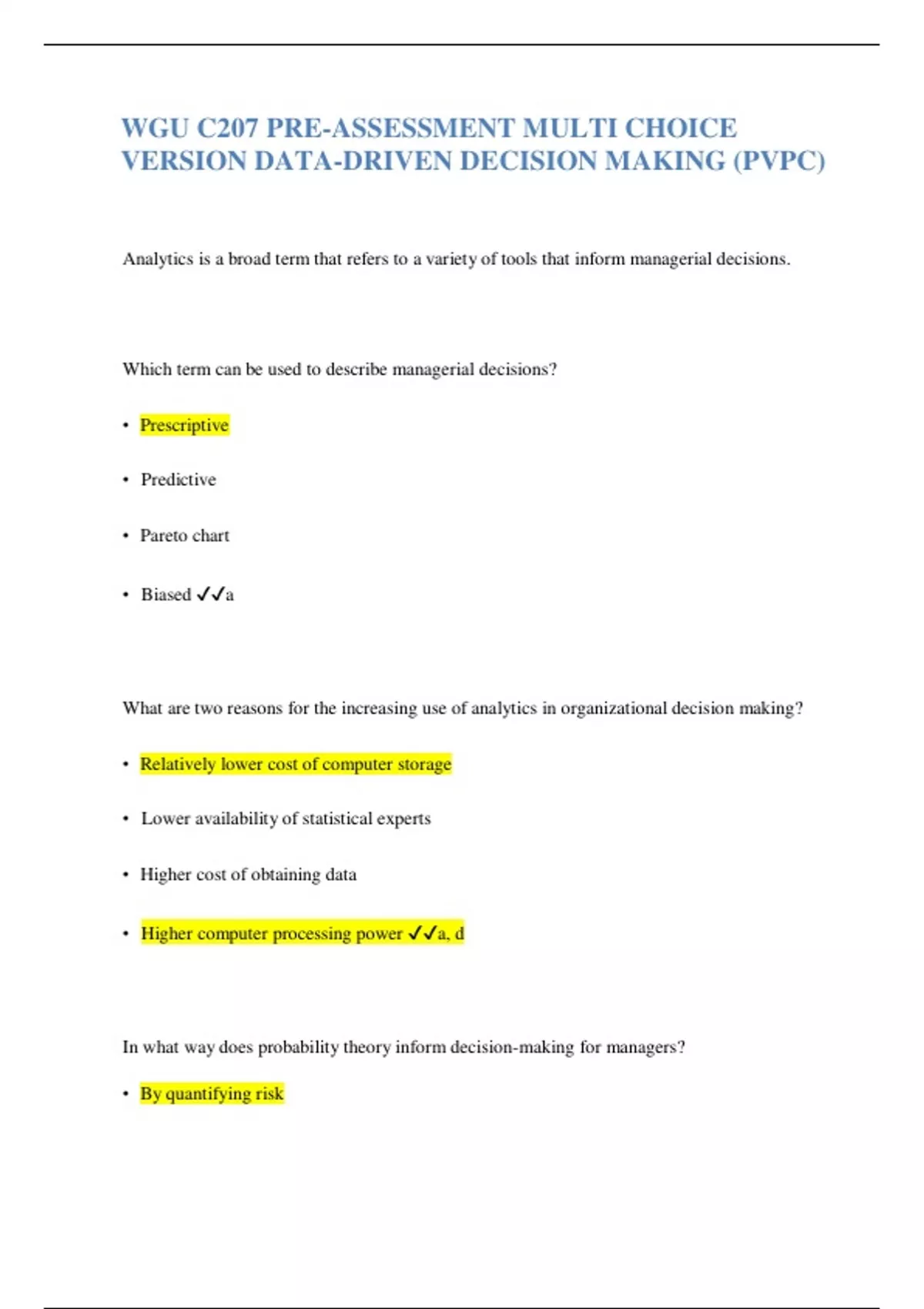 WGU C207 PRE-ASSESSMENT MULTI CHOICE VERSION DATA-DRIVEN DECISION MAKING (PVPC)