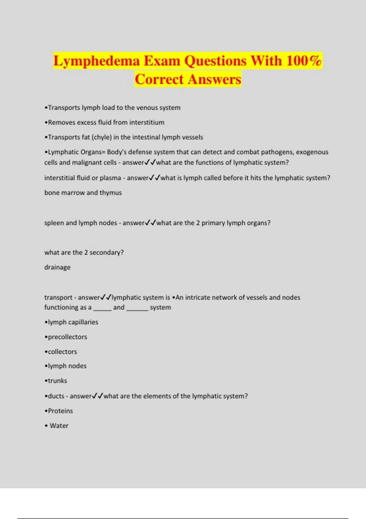 Lymphedema Exam Questions With 100% Correct Answers •Transports lymph load to the venous system •Removes excess fluid from interstitium •Transports fat (chyle) in the intestinal lymph vessels •Lymphatic Organs= Body's defense system that can detect and combat pathogens, exogenous cells and malignant cells - answerwhat are the functions of lymphatic system? interstitial fluid or plasma - answerwhat is lymph called before it hits the lymphatic system? bone marrow and thymus spleen and lymph nodes - answerwhat are the 2 primary lymph organs? what are the 2 secondary? drainage transport - answerlymphatic system is •An intricate network of vessels and nodes functioning as a _____ and ______ system •lymph capillaries •precollectors •collectors •lymph nodes •trunks •ducts - answerwhat are the elements of the lymphatic system? •Proteins • Water • Cells •WBC, Lymphocytes, Ca Cells, Bacteria, Virus, other •Fat •Cell debris - answerwhat things does the lymphatic system transport/makes up lymph load? lymph is not actively pumped by the heart but is forced through the vessels by contraction of skeletal muscles and breathing. - answerwhat is the major distinction between the lymph and cardiovascular systems? one way (has interrelationship with circulatory system) - answerlymphatic system is a _____ way system •Remaining fluid volume and plasma proteins in interstitium --> •Lymphatic capillaries called lymph when enters --> •Pre-collectors --> •Lymphatic Collectors --> •Lymph nodes --> •Lymph trunks --> •Right Lymphatic Duct and Thoracic Duct - answerwhat is the order of flow of lymph through lymphatic vessels? 10-15% - answerthe lymph system takes care of/drains _____-____% of interstitial fluid and the venous system takes care of the rest lymphatic capllaries - answerpart of lymph system: •Just under epidermis •One cell thick •Run close to capillaries •Valveless •Light skin stretch helps to open anchoring filaments so it will allow for proteins to come in •Overlapping endothelial cells "swinging flaps"= 4-6 times bigger than blood capillary opening one cell thick - answerhow thick are lymph capillaries? Anchoring filaments (so light stretch is important to help open them up) - answer•_____ ______ attach the endothelial cells of lymph capillaries to surrounding connective tissue light skin stretch - answer•_____ _____ ____ helps to open anchoring filaments of lymphatic capillaries so it will allow for proteins to come in bicuspid 2-3 mm (to prevent backflow since this is a one way system) - answer•Precollectors have _____ valves every ___-____ mm deep lymph vessels - answerpart of lymphatic system: •Parallel to venous system •Contain smooth muscle and valves (every 6-20 mm) smooth muscle valves (every 6-20 mm) - answerdeep lymph vessels contain _____ ______ and _______ lymphangion - answer•Section of a collector between a distal and proximal valve •Intrinsic contractility - vessel distension triggers reflexive muscle contraction vessel distension triggers a reflexive muscle contraction/they have automotoricity to pump lymph out - answerwhat does it mean that lymphagnions have intrinsic contracility? 400-700 1/2 - answerthere are _____-____ lymph nodes in body with _____ in abdomen lymph nodes - answer•400-700 in body with ½ in abdomen •Filtration