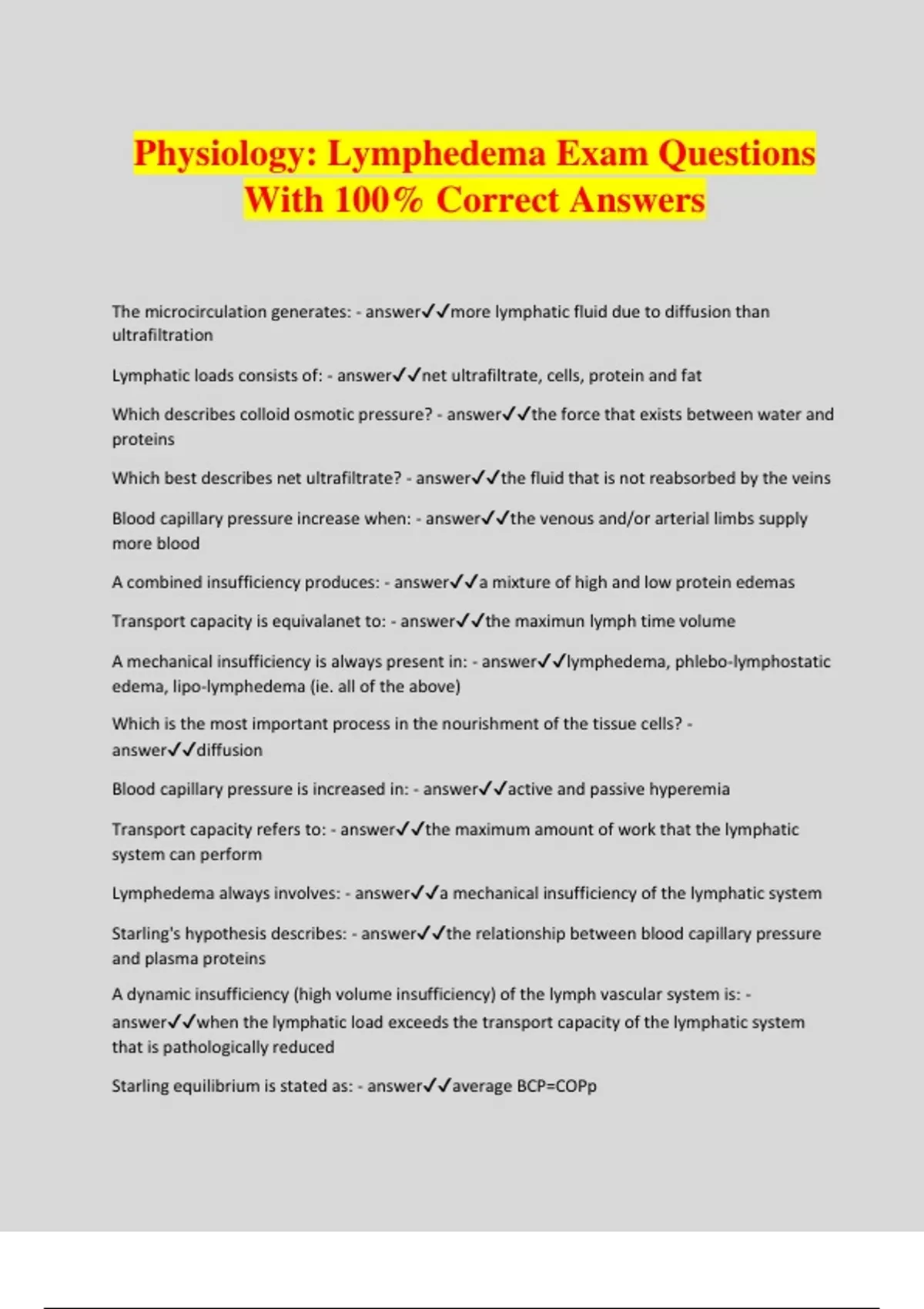 Physiology: Lymphedema Exam Questions With 100% Correct Answers The microcirculation generates: - answermore lymphatic fluid due to diffusion than ultrafiltration Lymphatic loads consists of: - answernet ultrafiltrate, cells, protein and fat Which describes colloid osmotic pressure? - answerthe force that exists between water and proteins Which best describes net ultrafiltrate? - answerthe fluid that is not reabsorbed by the veins Blood capillary pressure increase when: - answerthe venous and/or arterial limbs supply more blood A combined insufficiency produces: - answera mixture of high and low protein edemas