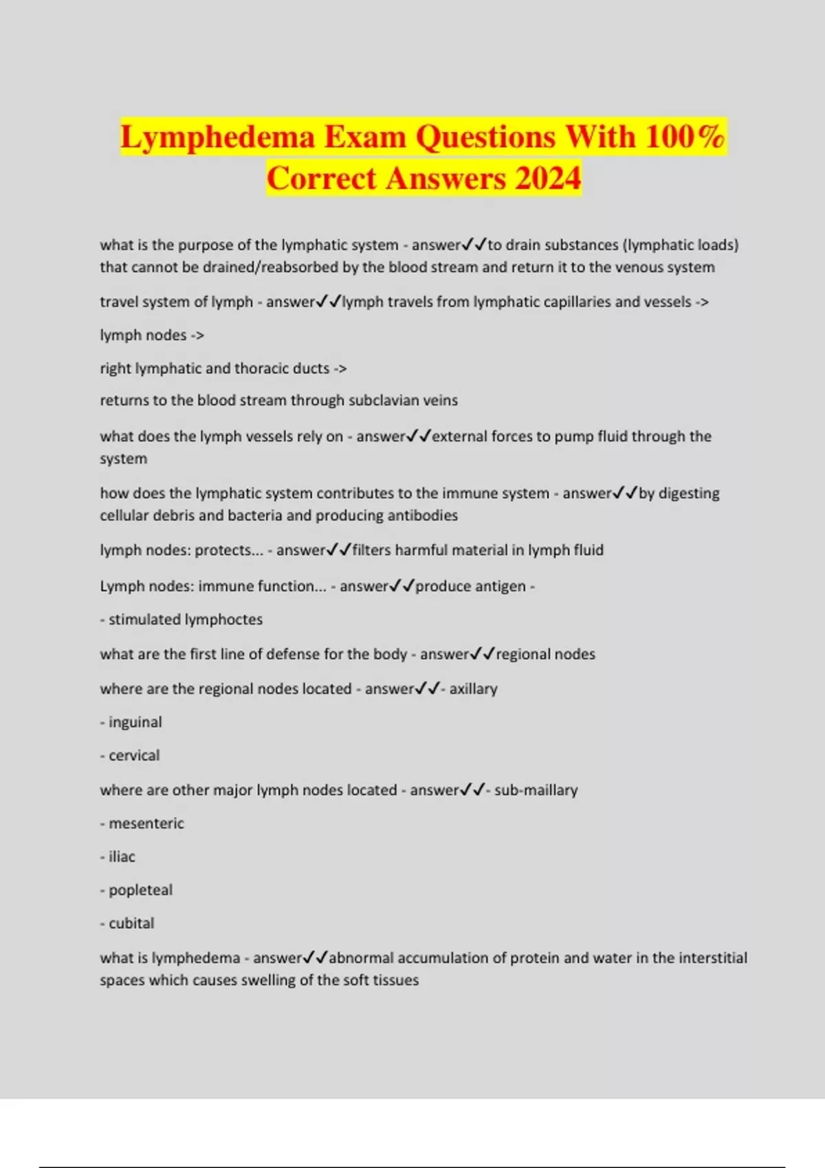 Lymphedema Exam Questions With 100% Correct Answers 2024 what is the purpose of the lymphatic system - answerto drain substances (lymphatic loads) that cannot be drained/reabsorbed by the blood stream and return it to the venous system travel system of lymph - answerlymph travels from lymphatic capillaries and vessels -> lymph nodes -> right lymphatic and thoracic ducts -> returns to the blood stream through subclavian veins what does the lymph vessels rely on - answerexternal forces to pump fluid through the system how does the lymphatic system contributes to the immune system - answerby digesting cellular debris and bacteria and producing antibodies lymph nodes: protects... - answerfilters harmful material in lymph fluid Lymph nodes: immune function... - answerproduce antigen - - stimulated lymphoctes what are the first line of defense for the body - answerregional nodes where are the regional nodes located - answer- axillary - inguinal - cervical where are other major lymph nodes located - answer- sub-maillary - mesenteric - iliac - popleteal - cubital what is lymphedema - answerabnormal accumulation of protein and water in the interstitial spaces which causes swelling of the soft tissues