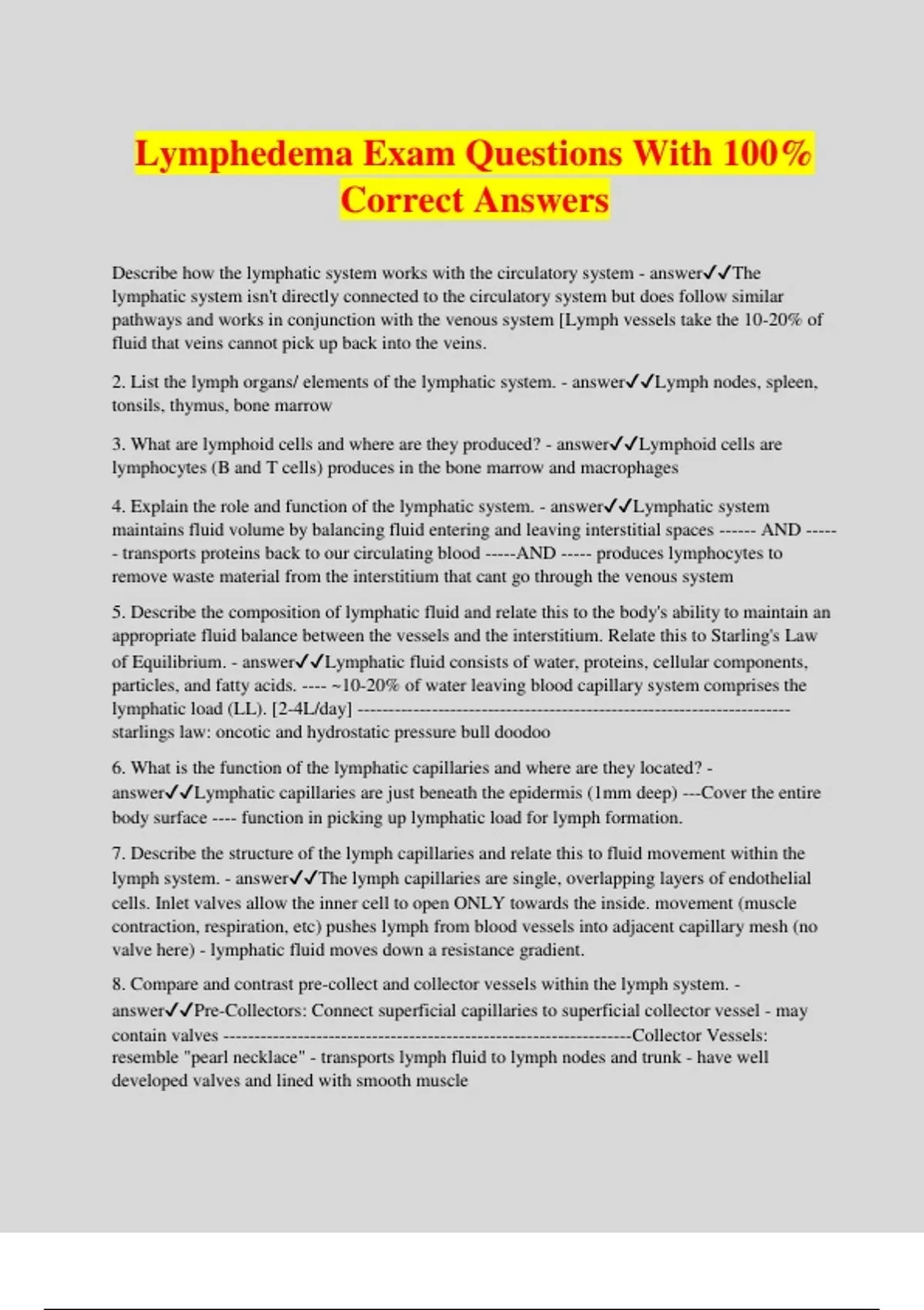 Lymphedema Exam Questions With 100% Correct Answers Describe how the lymphatic system works with the circulatory system - answerThe lymphatic system isn't directly connected to the circulatory system but does follow similar pathways and works in conjunction with the venous system [Lymph vessels take the 10-20% of fluid that veins cannot pick up back into the veins. 2. List the lymph organs/ elements of the lymphatic system. - answerLymph nodes, spleen, tonsils, thymus, bone marrow 3. What are lymphoid cells and where are they produced? - answerLymphoid cells are lymphocytes (B and T cells) produces in the bone marrow and macrophages 4. Explain the role and function of the lymphatic system. - answerLymphatic system maintains fluid volume by balancing fluid entering and leaving interstitial spaces ------ AND ----- - transports proteins back to our circulating blood -----AND ----- produces lymphocytes to remove waste material from the interstitium that cant go through the venous system 5. Describe the composition of lymphatic fluid and relate this to the body's ability to maintain an appropriate fluid balance between the vessels and the interstitium. Relate this to Starling's Law of Equilibrium. - answerLymphatic fluid consists of water, proteins, cellular components, particles, and fatty acids. ---- ~10-20% of water leaving blood capillary system comprises the lymphatic load (LL). [2-4L/day] ---------------------------------------------------------------------- starlings law: oncotic and hydrostatic pressure bull doodoo 6. What is the function of the lymphatic capillaries and where are they located? - answerLymphatic capillaries are just beneath the epidermis (1mm deep) ---Cover the entire body surface ---- function in picking up lymphatic load for lymph formation. 7. Describe the structure of the lymph capillaries and relate this to fluid movement within the lymph system. - answerThe lymph capillaries are single, overlapping layers of endothelial cells. Inlet valves allow the inner cell to open ONLY towards the inside. movement (muscle contraction, respiration, etc) pushes lymph from blood vessels into adjacent capillary mesh (no valve here) - lymphatic fluid moves down a resistance gradient. 8. Compare and contrast pre-collect and collector vessels within the lymph system. - answerPre-Collectors: Connect superficial capillaries to superficial collector vessel - may contain valves ------------------------------------------------------------------Collector Vessels: resemble "pearl necklace" - transports lymph fluid to lymph nodes and trunk - have well developed valves and lined with smooth muscle