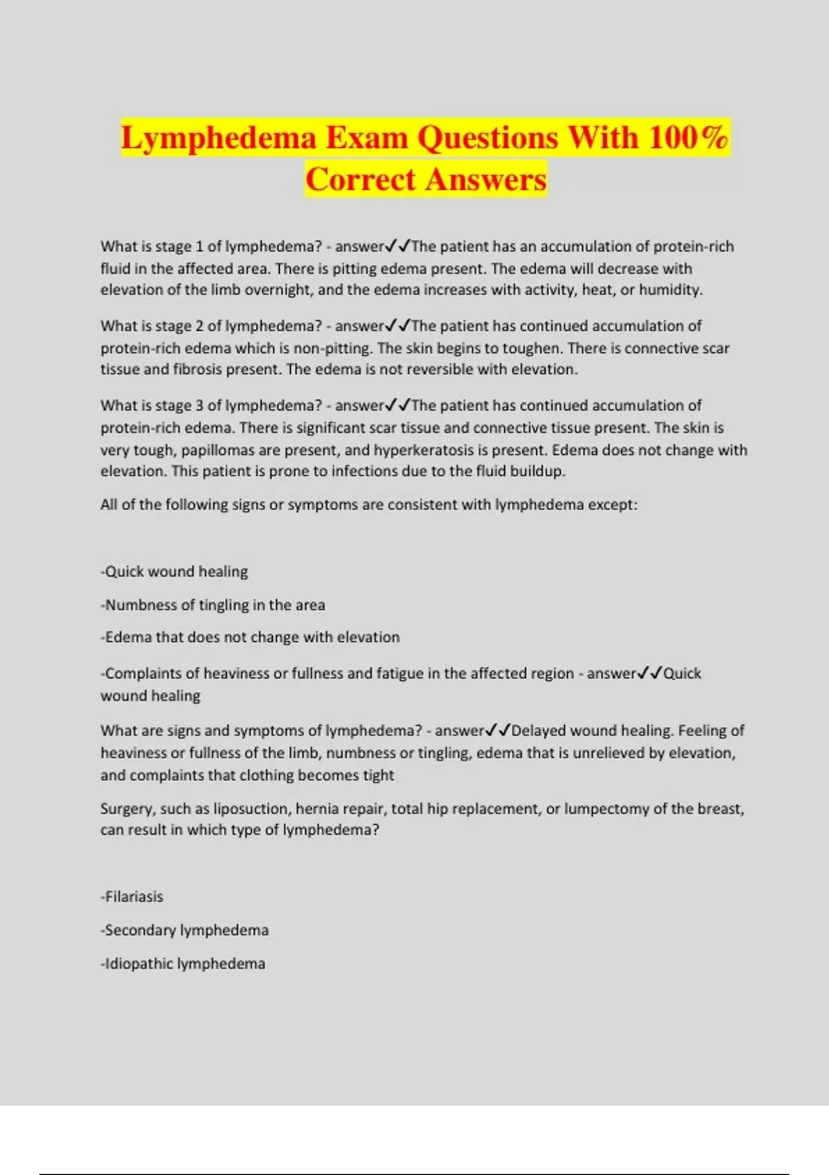 Lymphedema Exam Questions With 100% Correct Answers What is stage 1 of lymphedema? - answerThe patient has an accumulation of protein-rich fluid in the affected area. There is pitting edema present. The edema will decrease with elevation of the limb overnight, and the edema increases with activity, heat, or humidity. What is stage 2 of lymphedema? - answerThe patient has continued accumulation of protein-rich edema which is non-pitting. The skin begins to toughen. There is connective scar tissue and fibrosis present. The edema is not reversible with elevation. What is stage 3 of lymphedema? - answerThe patient has continued accumulation of protein-rich edema. There is significant scar tissue and connective tissue present. The skin is very tough, papillomas are present, and hyperkeratosis is present. Edema does not change with elevation. This patient is prone to infections due to the fluid buildup. All of the following signs or symptoms are consistent with lymphedema except: -Quick wound healing -Numbness of tingling in the area -Edema that does not change with elevation -Complaints of heaviness or fullness and fatigue in the affected region - answerQuick wound healing What are signs and symptoms of lymphedema? - answerDelayed wound healing. Feeling of heaviness or fullness of the limb, numbness or tingling, edema that is unrelieved by elevation, and complaints that clothing becomes tight Surgery, such as liposuction, hernia repair, total hip replacement, or lumpectomy of the breast, can result in which type of lymphedema? -Filariasis -Secondary lymphedema -Idiopathic lymphedema -Primary lymphedema - answerSecondary lymphedema Secondary lymphedema is caused by damage to one or more components of the lymph system. It is more common than primary lymphedema and is typically the result of any of the following causes: surgery, crush injury, radiation, chronic venous insufficiency, complications of paralysis, and disuse secondary to complex regional pain syndrome. What is secondary lymphedema? - answerSecondary lymphedema is caused by damage to one or more components of the lymph system. It is more common than primary lymphedema and is typically the result of any of the following causes: surgery, crush injury, radiation, chronic venous insufficiency, complications of paralysis, and disuse secondary to complex regional pain syndrome. What is primary/idiopathic lymphedema? - answerIs is thought to be the result of malformation of lymph nodes or vessels at birth. The incidence is unknown, but it is less common than secondary. It is also more common in female than in males Which of the following statements is true regarding medical management of lymphedema? -Diuretics work to reduce edema in lymphedema -Diuretics can decrease fibrosis and reduce extracellular protein -No clear pharmaceutical management is available -Surgical procedures can be largely effective in reducing lymphedema - answerNo clear pharmaceutical management is available Diuretics work if the edema is due to sodium retention. However, diuretics are ineffective in lymphedema. Diuretics can add to increased extracellular protein and increase fibrosis. Surgical procedures are mostly ineffective and are only typically used to treat severe involvement. All of the following statements regarding lymphedema are true except: -The lymph system cannot create collateral vessels to repair itself, leading to inflammation -Lymphedema may involve normal or abnormal amounts of fluid in the system -Lymphedema is characterized by inadequate transport of lymph volume through the lymph system