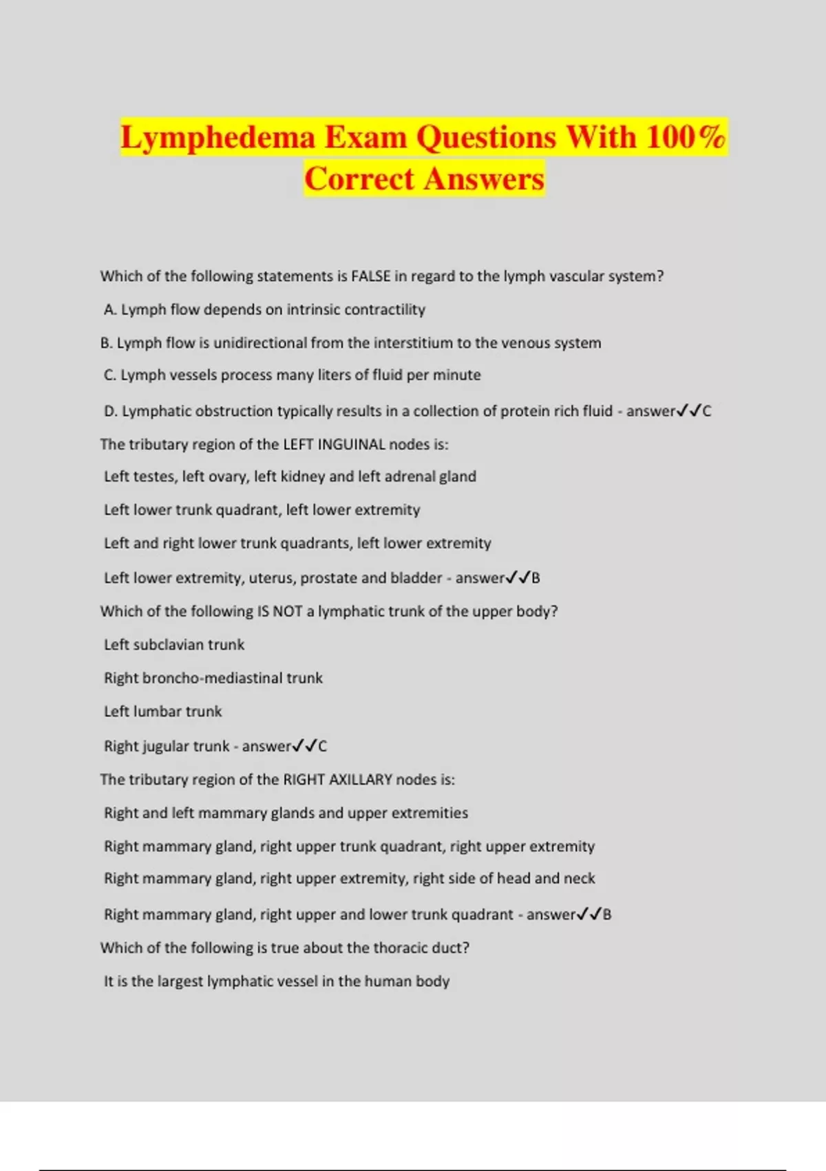 Lymphedema Exam Questions With 100% Correct Answers Which of the following statements is FALSE in regard to the lymph vascular system? A. Lymph flow depends on intrinsic contractility B. Lymph flow is unidirectional from the interstitium to the venous system C. Lymph vessels process many liters of fluid per minute D. Lymphatic obstruction typically results in a collection of protein rich fluid - answerC The tributary region of the LEFT INGUINAL nodes is: Left testes, left ovary, left kidney and left adrenal gland Left lower trunk quadrant, left lower extremity Left and right lower trunk quadrants, left lower extremity Left lower extremity, uterus, prostate and bladder - answerB Which of the following IS NOT a lymphatic trunk of the upper body? Left subclavian trunk Right broncho-mediastinal trunk Left lumbar trunk Right jugular trunk - answerC The tributary region of the RIGHT AXILLARY nodes is: Right and left mammary glands and upper extremities Right mammary gland, right upper trunk quadrant, right upper extremity Right mammary gland, right upper extremity, right side of head and neck Right mammary gland, right upper and lower trunk quadrant - answerB Which of the following is true about the thoracic duct? It is the largest lymphatic vessel in the human body It enters into the left venous angle All are true It starts at the cisterna chyli - answerC The functions of the lymphatic system include all of the following EXCEPT? Produce and store lymphocytes Absorb nutritional fatty acids from the intestines Return deoxygenated blood to the heart Absorb interstitial fluid and return it to the venous circulation - answerC Which of the following IS NOT a characteristic of lymph collectors? A three layer muscular wall Lymphangia Anchoring filaments Intrinsic contractility - answerC Which of the following lymphatic watersheds (WS) exist on both the anterior and posterior aspects of the body? Chaps Watershed Median-sagittal Watershed Spine of scapula Watershed Clavicle Watershed - answerB Which of the following is true about the intestinal lymphatic system? Intestinal lymph is called chyle The intestinal lymph sometimes appears white after a high protein meal The intestinal lymph is unable to carry proteins Water soluble vitamins are absorbed into the intestinal lymphatic system - answerA Which of the following statements regarding lymph and blood capillaries is true? Lymph capillaries have a smaller diameter than blood capillaries Blood capillaries have anchoring filaments and lymph capillaries do not A lack of a basement membrane in blood capillaries allows absorption of large protein molecules "Swinging flaps" of lymph capillaries allow absorption of large protein molecules - answerD Which of the following statements about lymph collectors is FALSE? Collectors connect with each other via anastamoses Deep collectors typically run along with arteries and veins Superficial collectors drain muscles, joints and ligaments Perforating vessels connect superficial to deep collectors through the muscle fascia - answerC Lymph fluid consists of which of the following? Proteins, red blood cells, lymphocytes, bile Proteins, water, insulin, white blood cells Fatty acids, cells, water, protein molecules Waste products, water, cholesterol, glucose - answerC The thoracic duct drains all of the following EXCEPT? The intestines, genitourinary organs, and liver The right arm and right trunk quadrant The right leg, left arm, and left side of the head and neck The left leg, both lower trunk quadrants, and both kidneys - answerB Which of the following statement about the lymph nodes is true? The majority of lymph nodes are found in the extremities Lymph nodes have more efferent than afferent lymph vessels There are 600-700 lymph nodes in the human body Lymph nodes are always palpable - answerC Which lymph vessel DOES NOT contain valves? Lymph collectors of the upper medial arm Pre-collectors of the gluteal region The abdominal thoracic duct Lymph capillaries of the dorsum of the hand - answerD What is the main task of the lymph capillaries? To ensure proper oxygenation of tissue To return blood from the interstitium to the heart To transport lymph through muscular valves towards lymph nodes To ensure the absorption of proteins and fluid from the interstitial spaces - answerD What structures make up the "venous angle"? Internal jugular and subclavian veins External and internal jugular veins Both internal jugular veins Internal jugular and cephalic veins - answerA The lymphatic organs of the body are: Thymus gland, tonsils, Peyer's patches, spleen Lymph nodes, kidneys, spleen, pancreas Thymus gland, liver, kidneys, spleen Tonsils, kidneys, Peyer's patches, pancreas - answerA All of the following factors influence lymph transport EXCEPT? External compression and stretching of tissue Muscle contraction and diaphragmatic breathing Blood sugar levels and muscle fatigue Arterial pulsation and manual lymphatic drainage - answerC Where do we find inter-axillary anastamoses? Across the transverse watershed Across the median-sagittal watershed Across the spine of scapula watershed Across the clavicle watershed - answerB