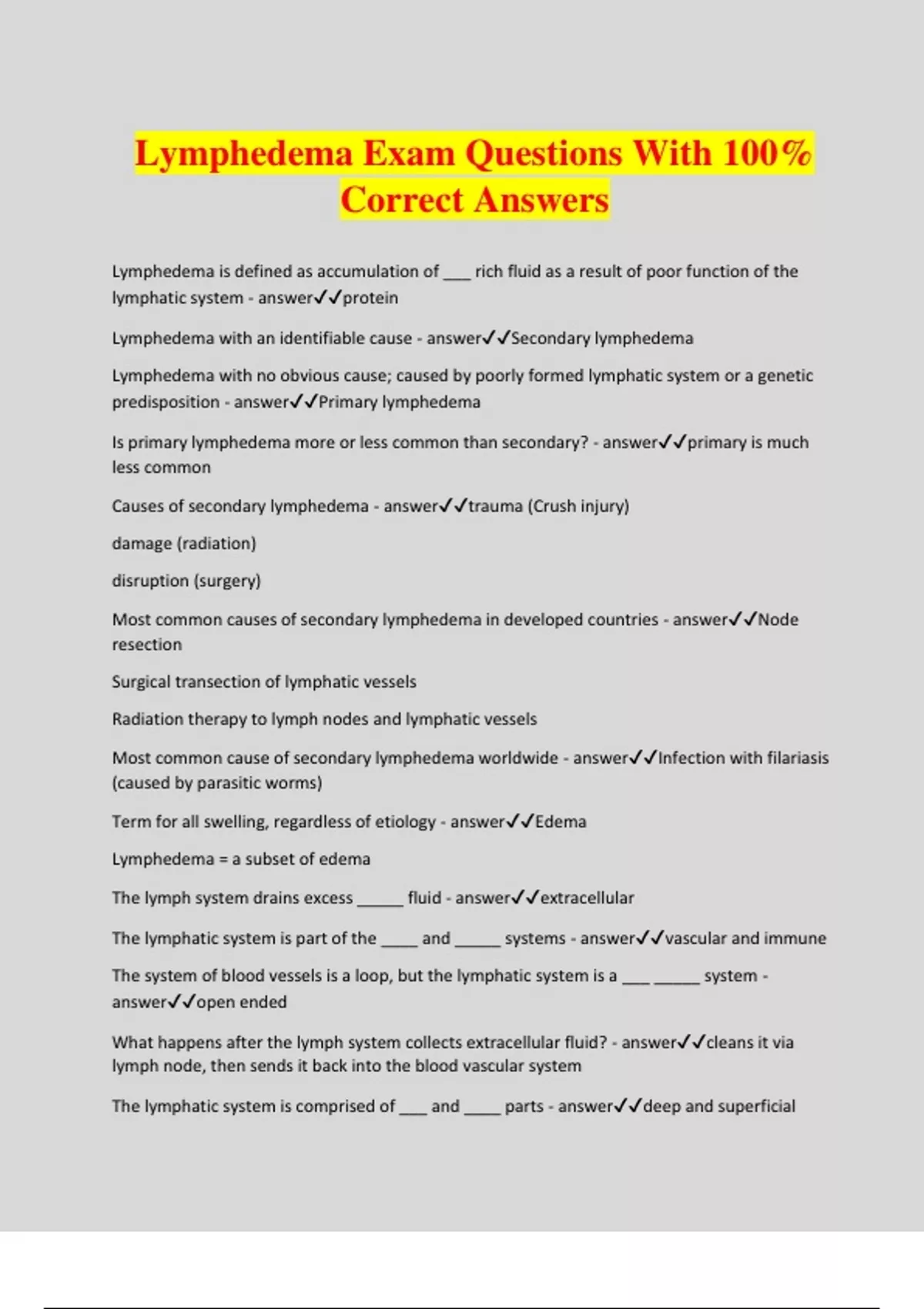Lymphedema Exam Questions With 100% Correct Answers Lymphedema is defined as accumulation of ___ rich fluid as a result of poor function of the lymphatic system - answerprotein Lymphedema with an identifiable cause - answerSecondary lymphedema Lymphedema with no obvious cause; caused by poorly formed lymphatic system or a genetic predisposition - answerPrimary lymphedema Is primary lymphedema more or less common than secondary? - answerprimary is much less common Causes of secondary lymphedema - answertrauma (Crush injury) damage (radiation) disruption (surgery) Most common causes of secondary lymphedema in developed countries - answerNode resection Surgical transection of lymphatic vessels Radiation therapy to lymph nodes and lymphatic vessels Most common cause of secondary lymphedema worldwide - answerInfection with filariasis (caused by parasitic worms) Term for all swelling, regardless of etiology - answerEdema Lymphedema = a subset of edema The lymph system drains excess _____ fluid - answerextracellular The lymphatic system is part of the ____ and _____ systems - answervascular and immune The system of blood vessels is a loop, but the lymphatic system is a ___ _____ system - answeropen ended What happens after the lymph system collects extracellular fluid? - answercleans it via lymph node, then sends it back into the blood vascular system The lymphatic system is comprised of ___ and ____ parts - answerdeep and superficial