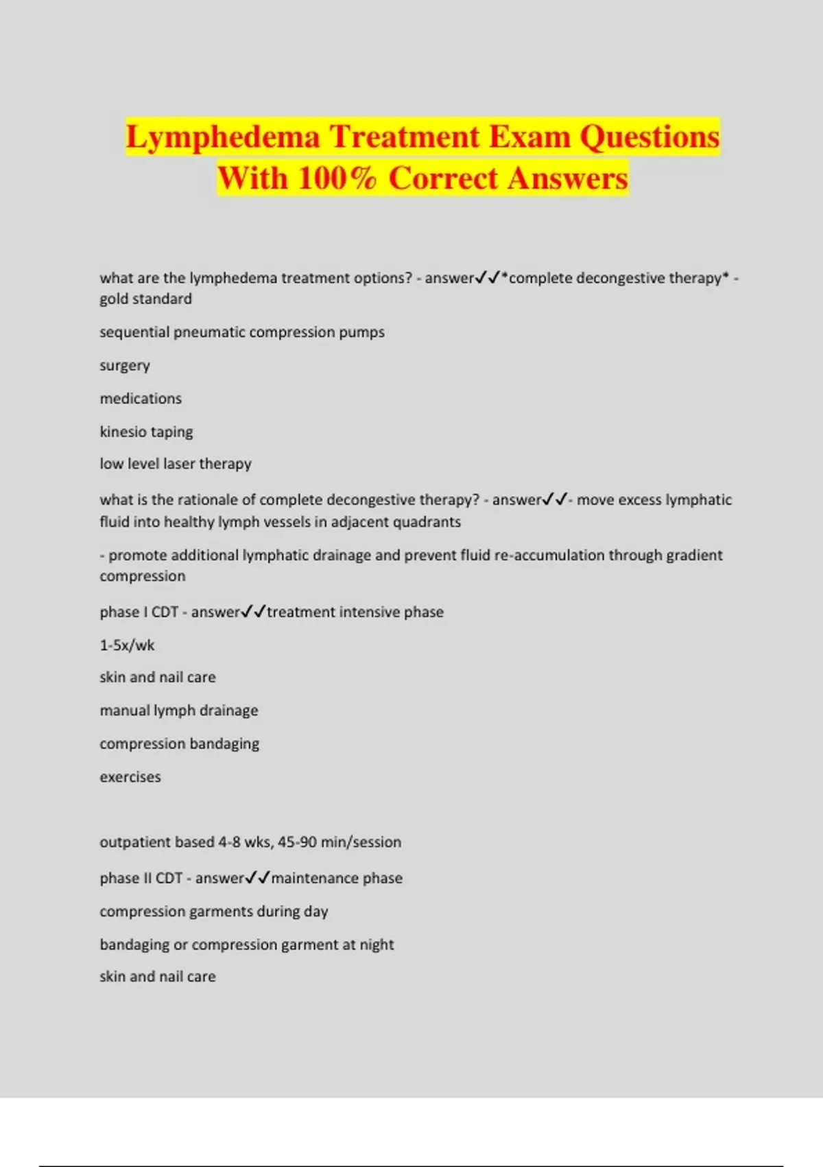 Lymphedema Treatment Exam Questions With 100% Correct Answers what are the lymphedema treatment options? - answer*complete decongestive therapy* - gold standard sequential pneumatic compression pumps surgery medications kinesio taping low level laser therapy what is the rationale of complete decongestive therapy? - answer- move excess lymphatic fluid into healthy lymph vessels in adjacent quadrants - promote additional lymphatic drainage and prevent fluid re-accumulation through gradient compression phase I CDT - answertreatment intensive phase 1-5x/wk skin and nail care manual lymph drainage compression bandaging exercises outpatient based 4-8 wks, 45-90 min/session phase II CDT - answermaintenance phase compression garments during day bandaging or compression garment at night skin and nail care