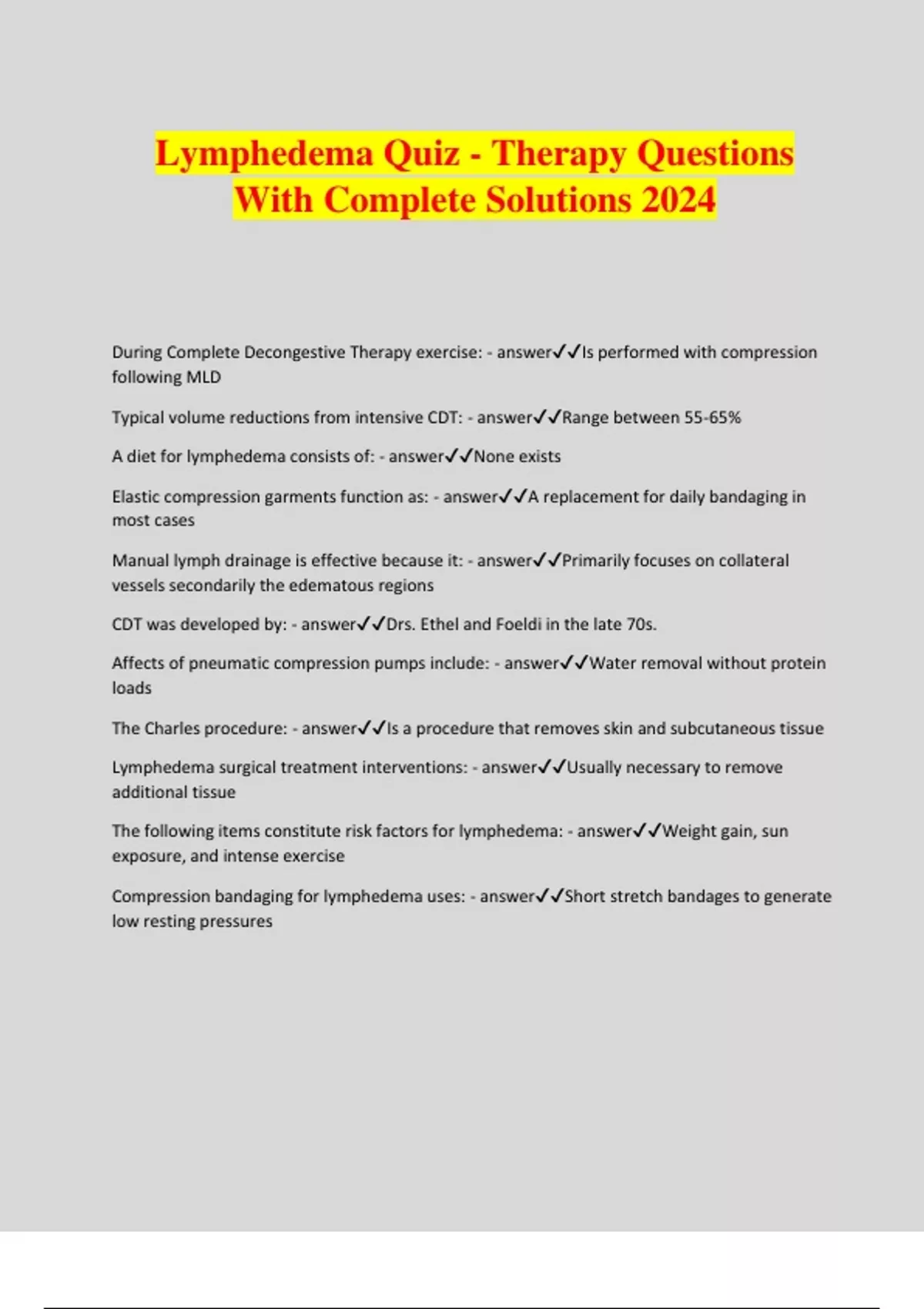 Lymphedema Quiz - Therapy Questions With Complete Solutions 2024