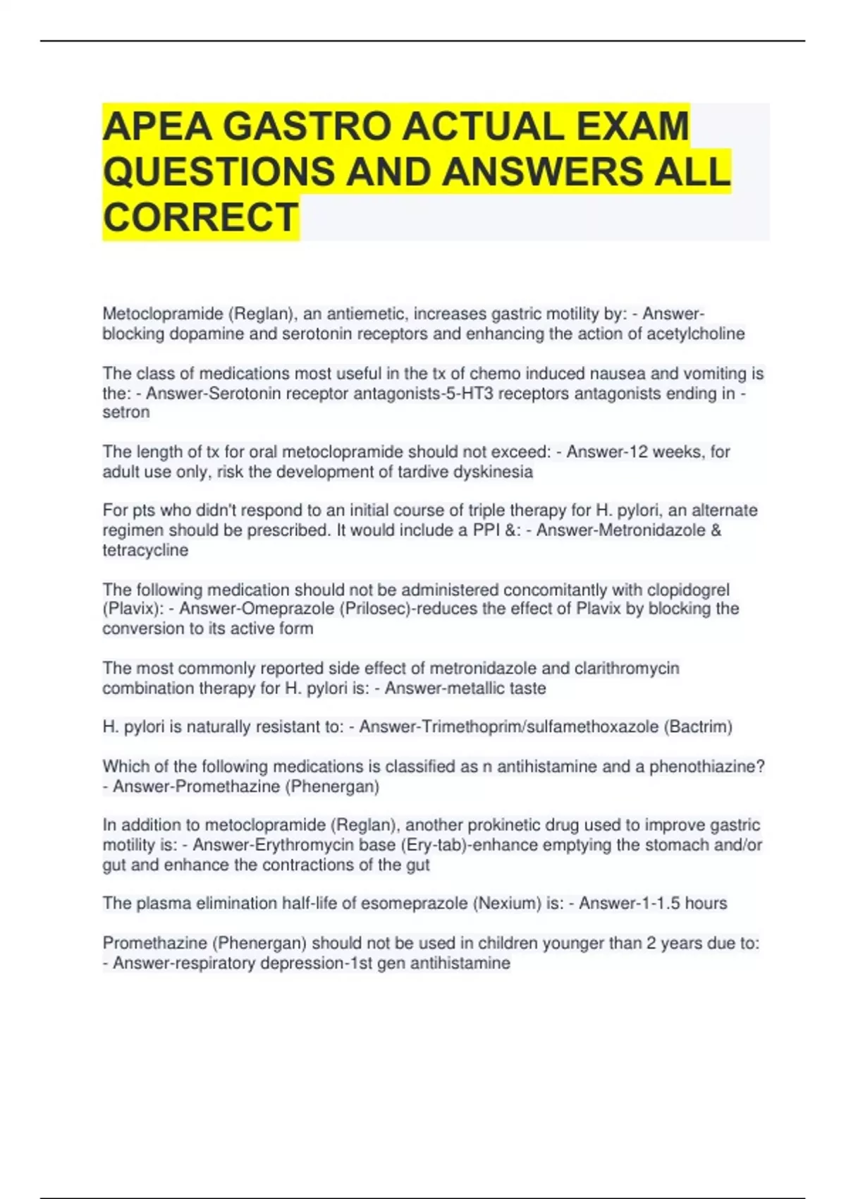 APEA GASTRO ACTUAL EXAM QUESTIONS AND ANSWERS ALL CORRECT Metoclopramide (Reglan), an antiemetic, increases gastric motility by: - Answer-blocking dopamine and serotonin receptors and enhancing the action of acetylcholine The class of medications most useful in the tx of chemo induced nausea and vomiting is the: - Answer-Serotonin receptor antagonists-5-HT3 receptors antagonists ending in -setron The length of tx for oral metoclopramide should not exceed: - Answer-12 weeks, for adult use only, risk the development of tardive dyskinesia For pts who didn't respond to an initial course of triple therapy for H. pylori, an alternate regimen should be prescribed. It would include a PPI &: - Answer-Metronidazole & tetracycline The following medication should not be administered concomitantly with clopidogrel (Plavix): - Answer-Omeprazole (Prilosec)-reduces the effect of Plavix by blocking the conversion to its active form The most commonly reported side effect of metronidazole and clarithromycin combination therapy for H. pylori is: - Answer-metallic taste H. pylori is naturally resistant to: - Answer-Trimethoprim/sulfamethoxazole (Bactrim) Which of the following medications is classified as n antihistamine and a phenothiazine? - Answer-Promethazine (Phenergan) In addition to metoclopramide (Reglan), another prokinetic drug used to improve gastric motility is: - Answer-Erythromycin base (Ery-tab)-enhance emptying the stomach and/or gut and enhance the contractions of the gut