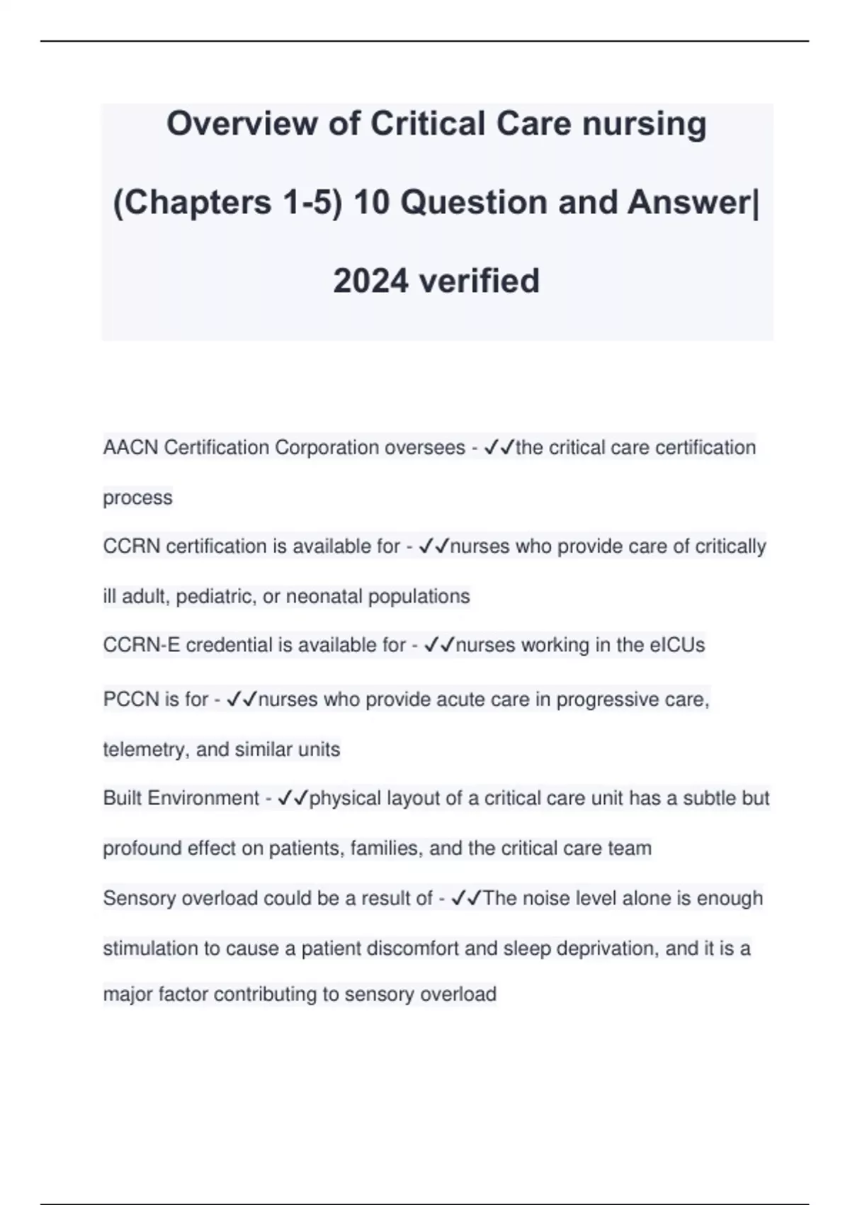 Overview of Critical Care nursing (Chapters 1-5) 10 Question and Answer| 2024 verified AACN Certification Corporation oversees - the critical care certification process CCRN certification is available for - nurses who provide care of critically ill adult, pediatric, or neonatal populations CCRN-E credential is available for - nurses working in the eICUs PCCN is for - nurses who provide acute care in progressive care, telemetry, and similar units Built Environment - physical layout of a critical care unit has a subtle but profound effect on patients, families, and the critical care team Sensory overload could be a result of - The noise level alone is enough stimulation to cause a patient discomfort and sleep deprivation, and it is a major factor contributing to sensory overload