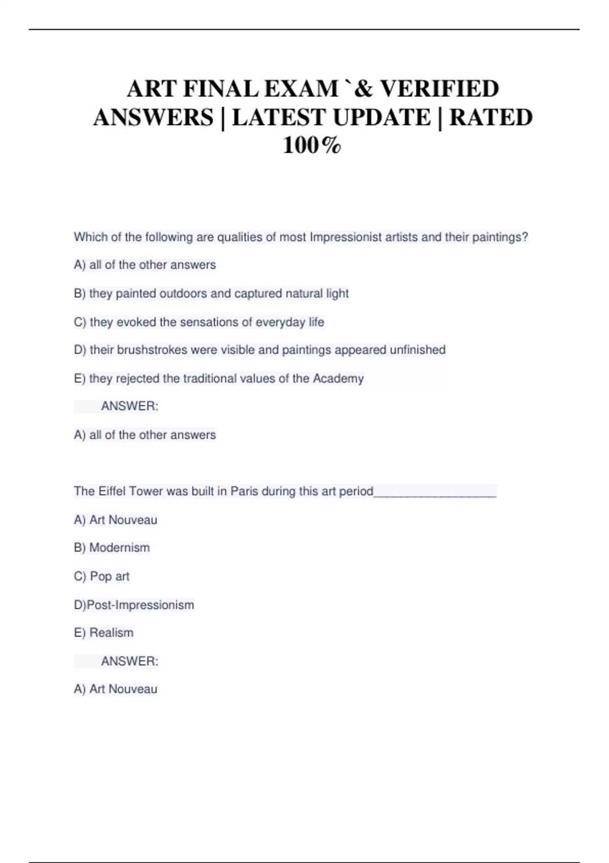 ART FINAL EXAM `& VERIFIED ANSWERS | LATEST UPDATE | RATED 100%
