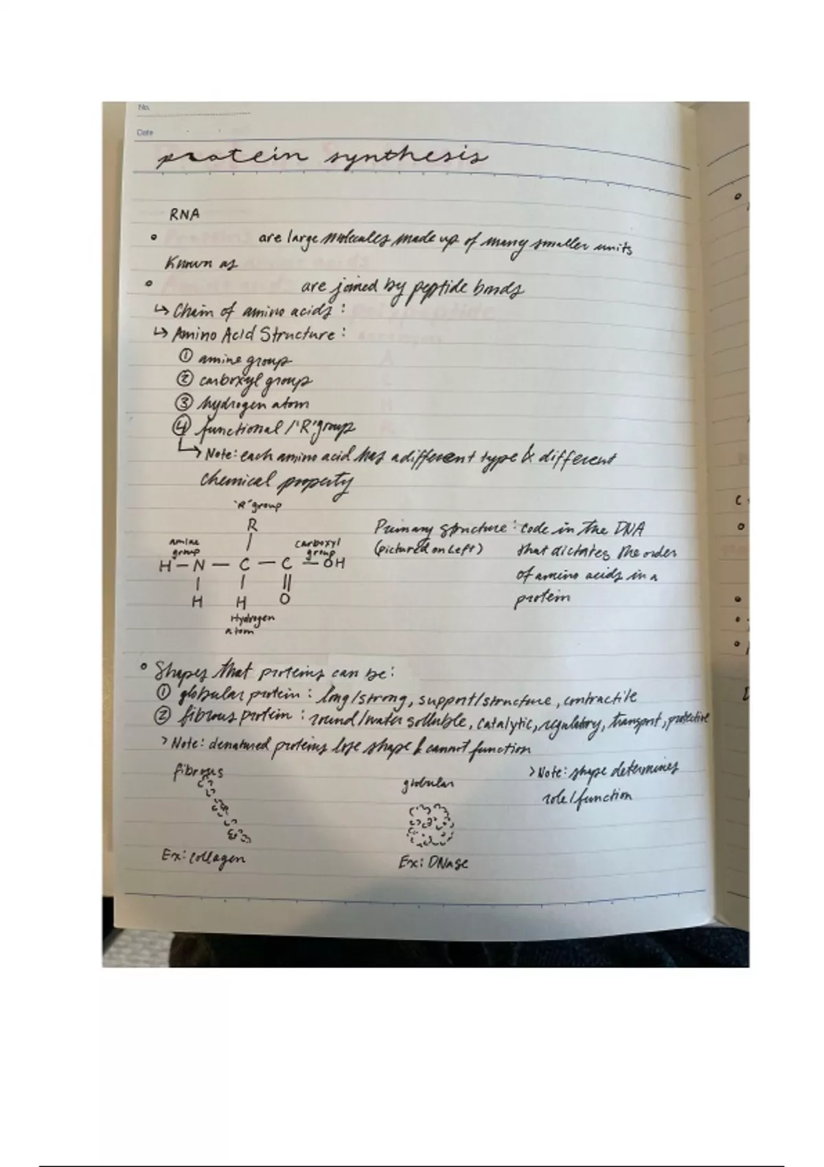 These notes highlight how protein synthesis works in RNA, the transcription and translation processes, DNA versus RNA, the three types of RNA, as well as different types of mutations. There are examples and drawn pictures.