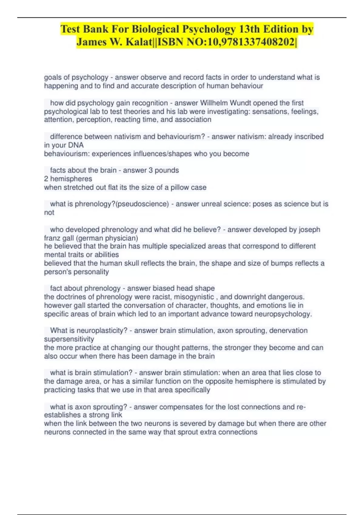 Test Bank For Biological Psychology 13th Edition by James W. Kalat||ISBN NO:10,9781337408202|