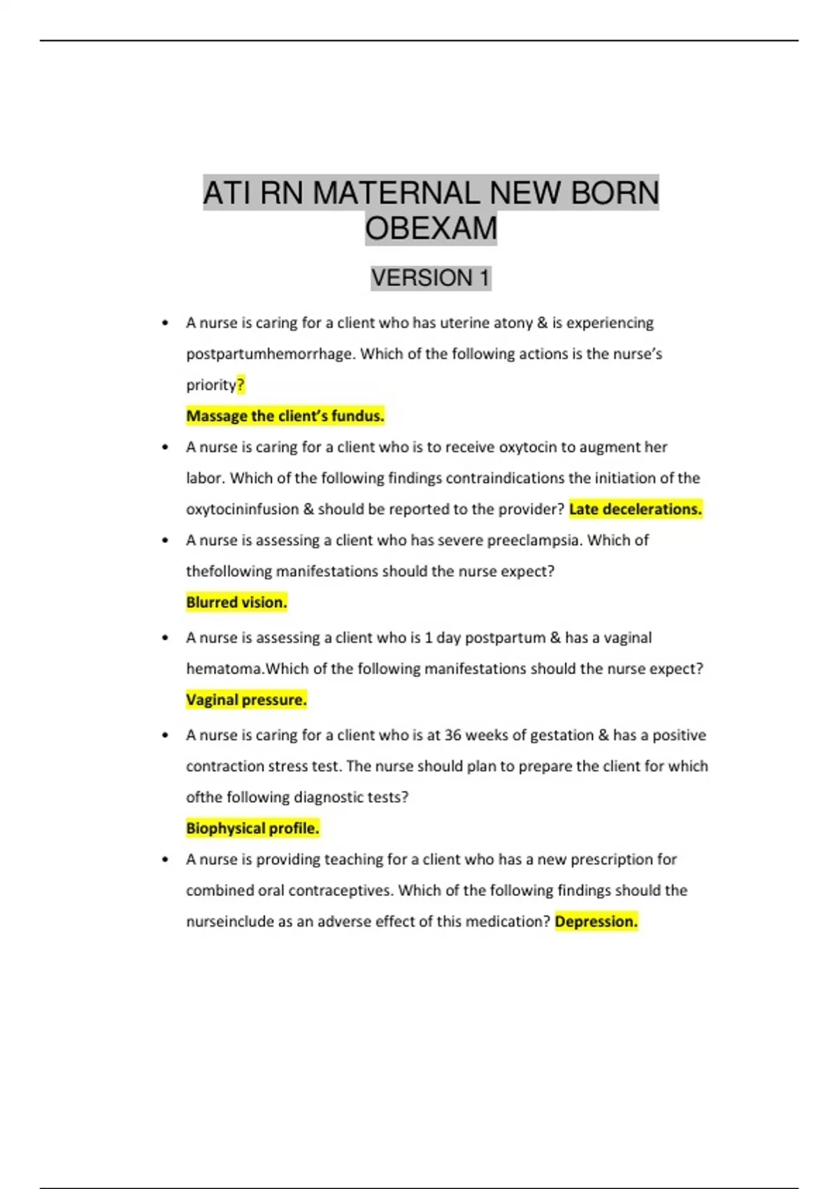 ATI RN MATERNAL NEW BORN OB EXAM VERSION 1