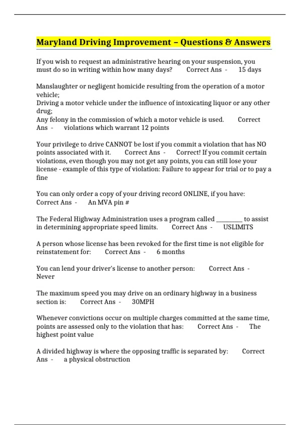 maryland driving improvement questions answers