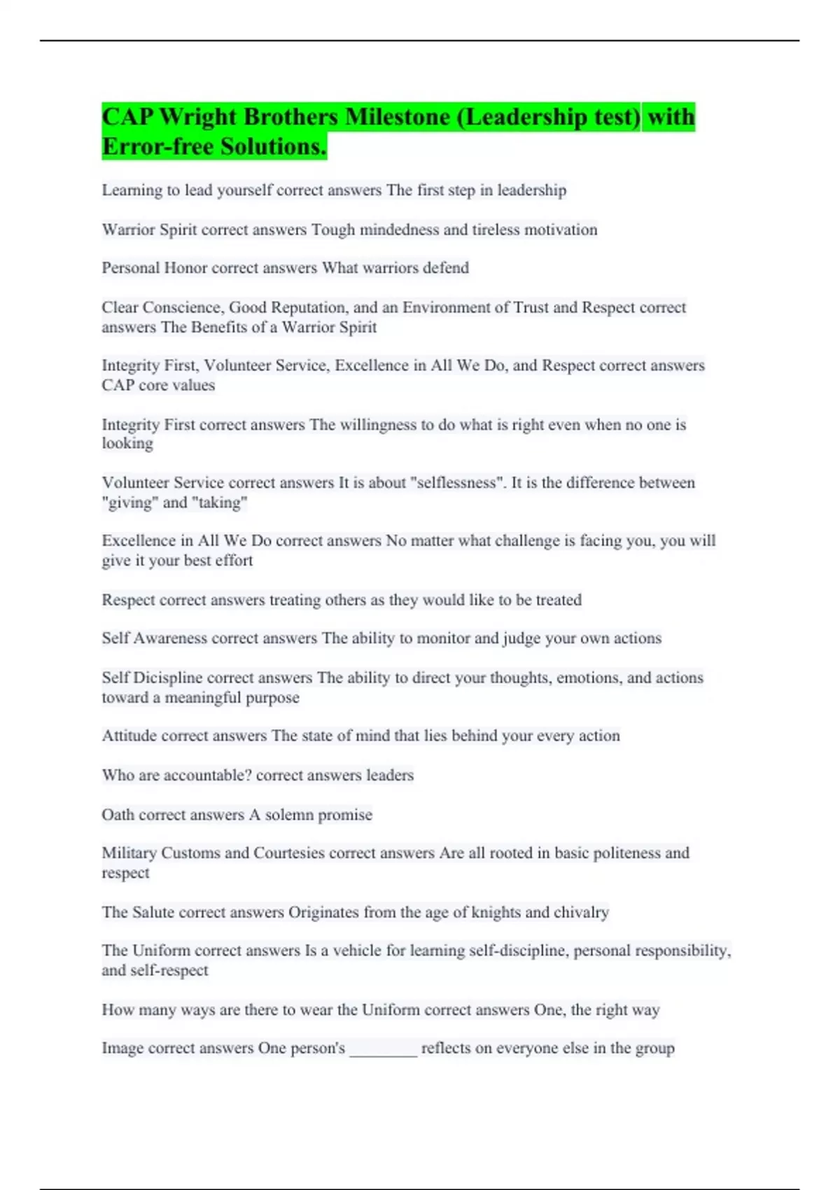 Learning to lead yourself correct answers The first step in leadership Warrior Spirit correct answers Tough mindedness and tireless motivation Personal Honor correct answers What warriors defend Clear Conscience, Good Reputation, and an Environment of Trust and Respect correct answers The Benefits of a Warrior Spirit Integrity First, Volunteer Service, Excellence in All We Do, and Respect correct answers CAP core values Integrity First correct answers The willingness to do what is right even when no one is looking Volunteer Service correct answers It is about "selflessness". It is the difference between "giving" and "taking" Excellence in All We Do correct answers No matter what challenge is facing you, you will give it your best effort Respect correct answers treating others as they would like to be treated Self Awareness correct answers The ability to monitor and judge your own actions Self Dicispline correct answers The ability to direct your thoughts, emotions, and actions toward a meaningful purpose Attitude correct answers The state of mind that lies behind your every action Who are accountable? correct answers leaders Oath correct answers A solemn promise Military Customs and Courtesies correct answers Are all rooted in basic politeness and respect The Salute correct answers Originates from the age of knights and chivalry The Uniform correct answers Is a vehicle for learning self-discipline, personal responsibility, and self-respect How many ways are there to wear the Uniform correct answers One, the right way Image correct answers One person's ________ reflects on everyone else in the group