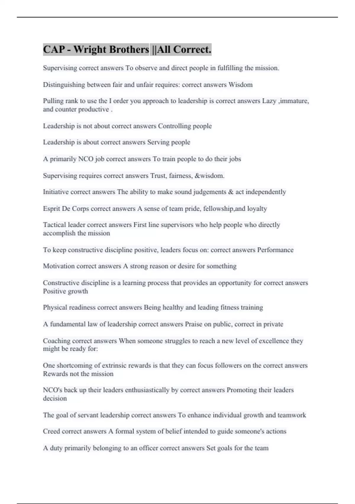 Supervising correct answers To observe and direct people in fulfilling the mission. Distinguishing between fair and unfair requires: correct answers Wisdom Pulling rank to use the I order you approach to leadership is correct answers Lazy ,immature, and counter productive . Leadership is not about correct answers Controlling people Leadership is about correct answers Serving people A primarily NCO job correct answers To train people to do their jobs Supervising requires correct answers Trust, fairness, &wisdom. Initiative correct answers The ability to make sound judgements & act independently Esprit De Corps correct answers A sense of team pride, fellowship,and loyalty Tactical leader correct answers First line supervisors who help people who directly accomplish the mission To keep constructive discipline positive, leaders focus on: correct answers Performance Motivation correct answers A strong reason or desire for something Constructive discipline is a learning process that provides an opportunity for correct answers Positive growth Physical readiness correct answers Being healthy and leading fitness training A fundamental law of leadership correct answers Praise on public, correct in private Coaching correct answers When someone struggles to reach a new level of excellence they might be ready for: One shortcoming of extrinsic rewards is that they can focus followers on the correct answers Rewards not the mission NCO's back up their leaders enthusiastically by correct answers Promoting their leaders decision The goal of servant leadership correct answers To enhance individual growth and teamwork Creed correct answers A formal system of belief intended to guide someone's actions A duty primarily belonging to an officer correct answers Set goals for the team