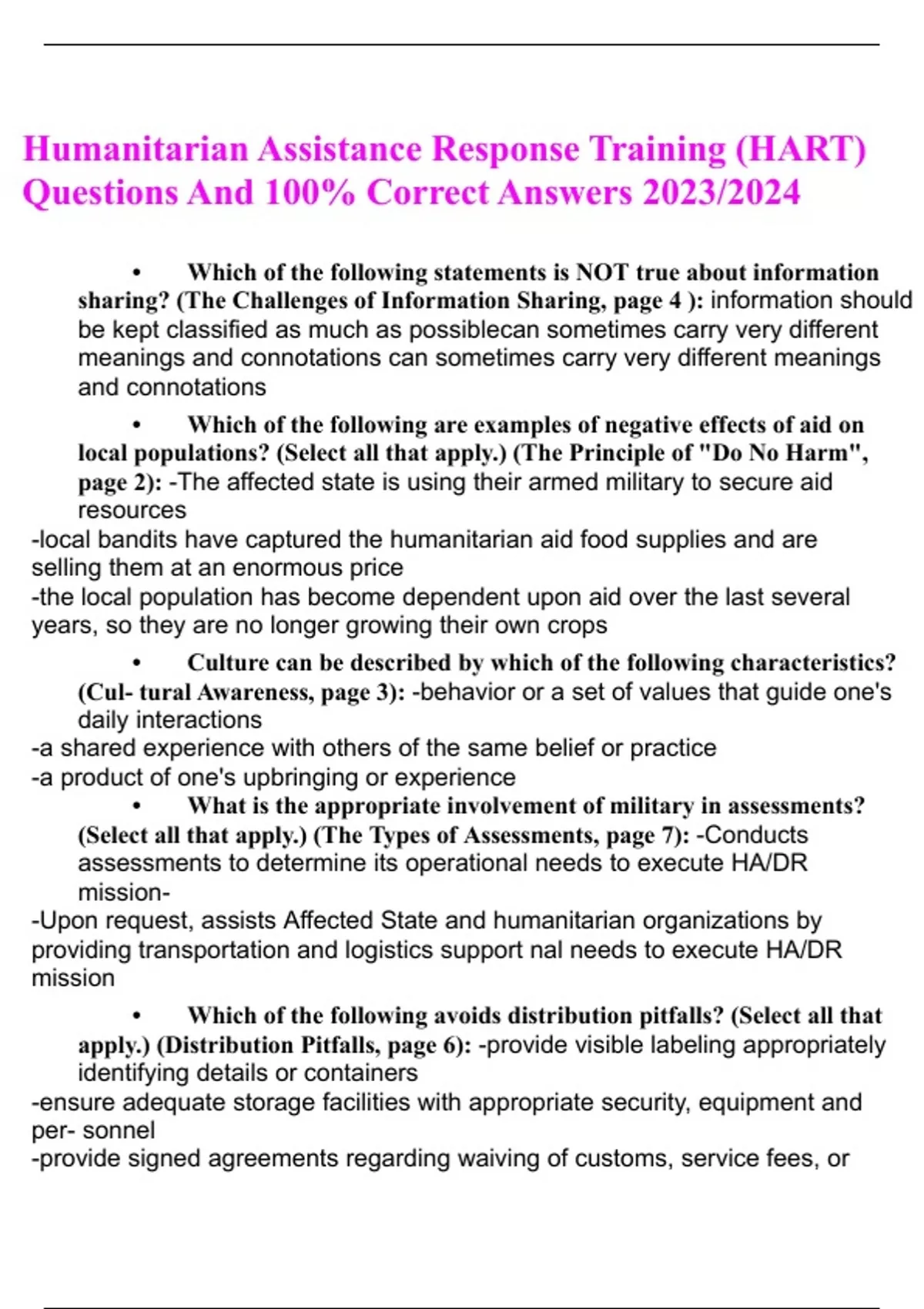 Humanitarian Assistance Response Training (HART) (9.5 hrs) Questions and Answers Latest | 100% correct answers
