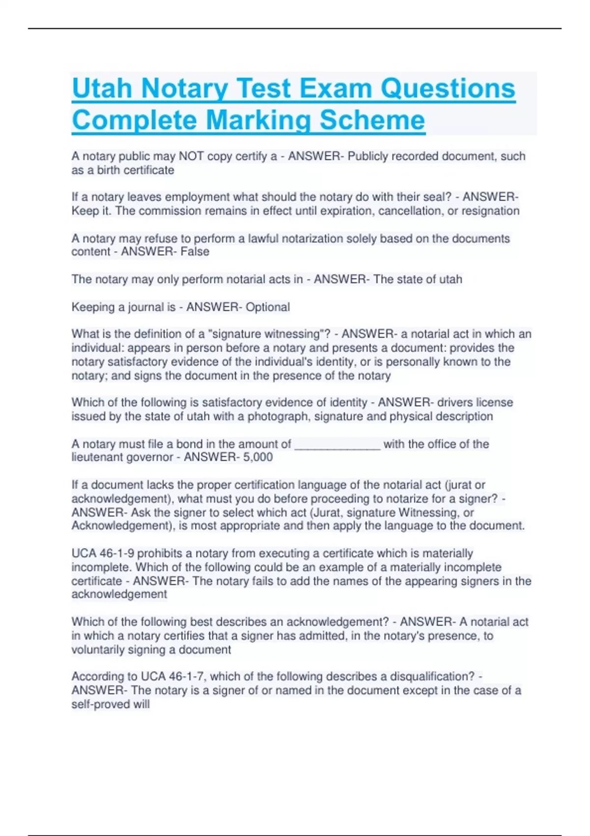 UHC Certification 2023 Exam Questions With Answers All Correct Cynthia is turning 65 on July 5. Her Medicare Part A and Part B will be effective on July 1. Using her Initial Election Period (IEP), when can she submit an application for a Medicare Advantage or Prescription Drug plan? March 1 through July 31 April 1 through October 31 July 1 through December 30 June 1 through July 31 - ANSWER- Not July 1 - Dec 30 - WRONG April 1 through October 31 - CORRECT Annual Election Period (AEP) is a time when. . . Consumers can only disenrollment from their Medicare Advantage or Prescription Drug Plan and return to Original Medicare. Consumers can only enroll in a Medicare Advantage Plan or switch to a different Medicare Advantage plan. Consumers can elect to switch to a different plan or join a Medicare Advantage plan or Prescription Drug Plan. Only certain Medicare-eligible consumers can make changes. - ANSWER- Consumers can elect to switch to a different plan or join a Medicare Advantage plan or Prescription Drug Plan. Which statement regarding Star Ratings is true? Medicare uses a 5-star rating system to illustrate a plan's performance and quality. The agent said that the Star Ratings are based on a plan's performance from two years ago and, therefore; do not accurately reflect a plan's current value. Star Ratings are based on a plan's performance from the prior year and, therefore, may not accurately reflect a plan's current value. Medicare uses a 5-star rating system to illustrate the plan's relative popularity in a market as measured by membership and retention rates. - ANSWER- Medicare uses a 5-star rating system to illustrate a plan's performance and quality. Which of the following is not considered unsolicited contact with a Medicare eligible consumer according to CMS regulations and UnitedHealth care’s rules, policies, and procedures? Emailing a marketing brochure to a consumer whose email address was obtained on a purchased lead list. Approaching a consumer in a common area of a senior living complex Placing a marketing brochure on the door handle of the consumer's residence Mailing a marketing brochure to the consumer via postal mail - ANSWER- Mailing a marketing brochure to the consumer via postal mail What information should be obtained from the consumer when conducting a thorough needs assessment? (Select 2) The providers they see and medications they take to determine network and formulary status. Their current health care coverage, including what they like about it and what they don't. Their favorite foods and hygiene products to determine if they are covered by a grocery allowance - ANSWER- The providers they see and medications they take to determine network and formulary status. Their current health care coverage, including what they like about it and what they don't. When completing an enrollment application in LEAN, why is an agent prohibited from entering his or her own email address in a field available for the consumer's email address? The enrollment application may be denied. The consumer/member would not receive plan related correspondence intended for him/her. The agent may experience commission payment processing issues. - ANSWER- The consumer/member would not receive plan related correspondence intended for him/her What is the purpose of the Statement of Understanding? It ensures that when consumers sign the Medicare Advantage and/or Part D Enrollment Application, they are acknowledging their understanding of monthly premiums and deductibles. It ensures that when consumers sign the Medicare Advantage and/or Part D Enrollment Application, they are acknowledging their understanding of standard enrollment and disenrollment procedures. It ensures that when consumers complete the Medicare Advantage and/or Part D Enrollment Application, they are acknowledging their understanding that they are actually enrolling, in which plan they are enrolling, and standard disclosures. - ANSWER- It ensures that when consumers complete the Medicare Advantage and/or Part D Enrollment Application, they are acknowledging their understanding that they are actually enrolling, in which plan they are enrolling, and standard disclosures Which of the following must an agent obtain from the consumer no less than 48 hours (unless an exception applies) before an in-person, online, or telephonic marketing appointment? Scope of Appointment Statement of Understanding Permission to Call - ANSWER- Scope of Appointment Which statement is accurate when a consumer has a Power of Attorney (POA)? The POA may attend a personal/individual marketing appointment with the consumer but has no authority to sign the Enrollment Application. If the POA signs the Enrollment Application, they must be able to provide documentation upon request by the Plan that indicates authority under state law to enroll the consumer. The POA may sign the Enrollment Application and must submit documentation that indicates his authority under state law to enroll his mother with the application. - ANSWER- If the POA signs the Enrollment Application; they must be able to provide documentation upon request by the Plan that indicates authority under state law to enroll the consumer. Select the option that describes the coverage combinations a member can be enrolled in at the same time. MA-Only PFFS plan and a stand-alone PDP MA-Only non-PFFS plan and a stand-alone PDP Medicare Supplement plan and MA-PD plan - ANSWER- Medicare Supplement plan and MA-PD plan - WRONG In which situation will a m