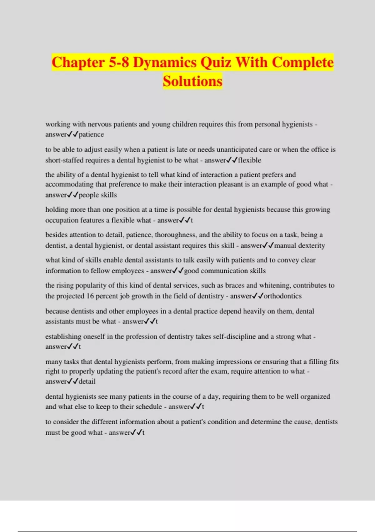 Chapter 5-8 Dynamics Quiz With Complete Solutions working with nervous patients and young children requires this from personal hygienists - answerpatience to be able to adjust easily when a patient is late or needs unanticipated care or when the office is short-staffed requires a dental hygienist to be what - answerflexible the ability of a dental hygienist to tell what kind of interaction a patient prefers and accommodating that preference to make their interaction pleasant is an example of good what - answerpeople skills holding more than one position at a time is possible for dental hygienists because this growing occupation features a flexible what - answert besides attention to detail, patience, thoroughness, and the ability to focus on a task, being a dentist, a dental hygienist, or dental assistant requires this skill - answermanual dexterity what kind of skills enable dental assistants to talk easily with patients and to convey clear information to fellow employees - answergood communication skills the rising popularity of this kind of dental services, such as braces and whitening, contributes to the projected 16 percent job growth in the field of dentistry - answerorthodontics because dentists and other employees in a dental practice depend heavily on them, dental assistants must be what - answert establishing oneself in the profession of dentistry takes self-discipline and a strong what - answert many tasks that dental hygienists perform, from making impressions or ensuring that a filling fits right to properly updating the patient's record after the exam, require attention to what - answerdetail dental hygienists see many patients in the course of a day, requiring them to be well organized and what else to keep to their schedule - answert to consider the different information about a patient's condition and determine the cause, dentists must be good what - answert job prospects will be excellent for dental assistants in the near future, but some employers will favor those who can perform what kind of tasks - answert successful dentists display what kind of attitude toward their staff and patients - answert To become a dentist, a person must graduate from an _______ dental school, which is usually a 4-year program, after having completed at least 2 years of college-level, pre-dental education and taking the Dental Admission Test. - answera In the last 2 years of dental school, students treat patients under the supervision of licensed dentists, working in hospitals, outpatient clinics, community clinics, or other settings as well as taking classes that will be useful in managing a practice, such as communication _______ and business management. - answere Because how well clinical laboratory technologists do their jobs can literally mean the difference between life and death for a patient, people who choose this occupation must be reliable and what - answerh Because they often work as part of a team, laboratory assistants should be able to follow what - answerg Main employer of clinical laboratory technologists and technicians currently and in the near future - answerh Because of the current ______ of laboratory personnel, laboratory assistants can expect good employment opportunities in the coming years - answerh All states and the District of Columbia require dentists to be _____ in order to practice. - answeri in nearly every state, a person must graduate from an accredited dental hygiene program with a _________ , an associate's degree, a bachelor's degree, or a master's degree to become a dental hygienist. - answeri Dental hygienist programs include both academic classes and 650 hours of ______ clinical instruction. - answeri ________ differs from the other states in the title given to licensed dental hygienists, calling them RDHs (registered dental hygienists) or LDHs (licensed dental hygienists). - answeri