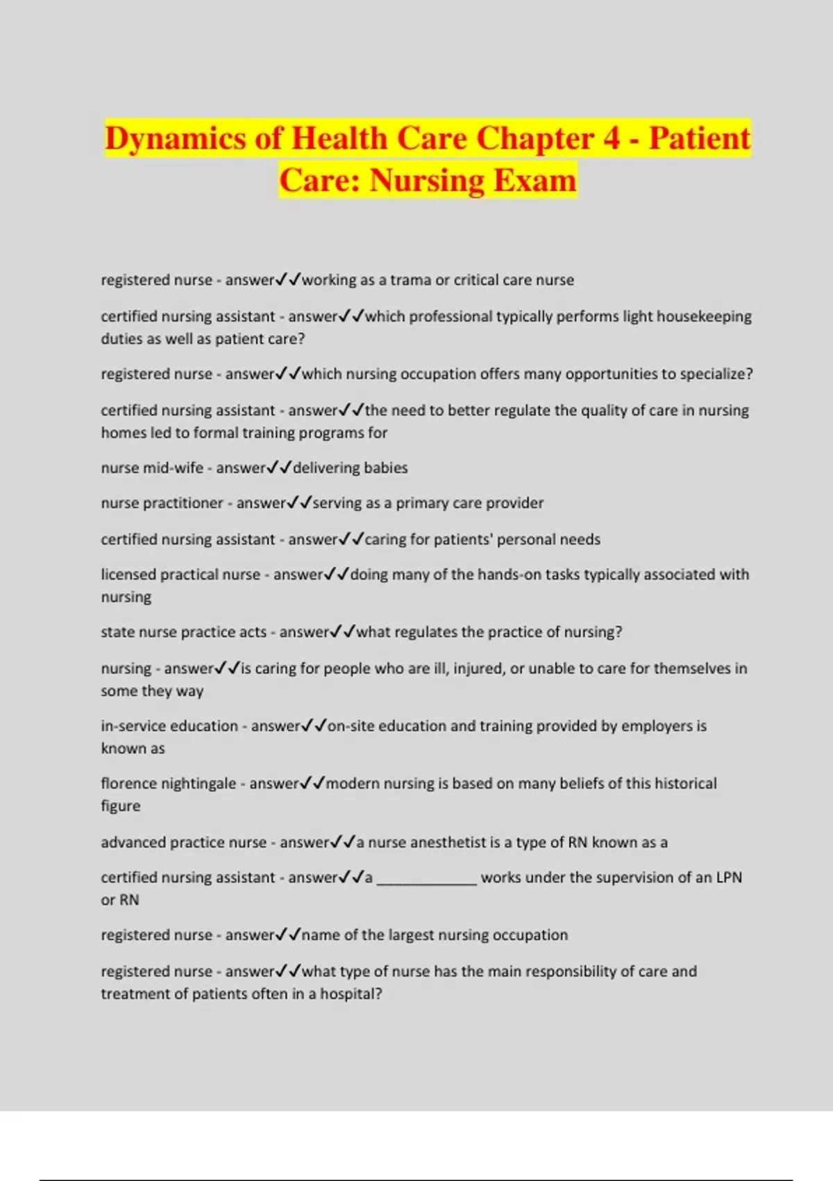 Dynamics of Health Care Chapter 4 - Patient Care: Nursing Exam registered nurse - answerworking as a trama or critical care nurse certified nursing assistant - answerwhich professional typically performs light housekeeping duties as well as patient care? registered nurse - answerwhich nursing occupation offers many opportunities to specialize? certified nursing assistant - answerthe need to better regulate the quality of care in nursing homes led to formal training programs for nurse mid-wife - answerdelivering babies nurse practitioner - answerserving as a primary care provider certified nursing assistant - answercaring for patients' personal needs licensed practical nurse - answerdoing many of the hands-on tasks typically associated with nursing state nurse practice acts - answerwhat regulates the practice of nursing? nursing - answeris caring for people who are ill, injured, or unable to care for themselves in some they way in-service education - answeron-site education and training provided by employers is known as florence nightingale - answermodern nursing is based on many beliefs of this historical figure advanced practice nurse - answera nurse anesthetist is a type of RN known as a certified nursing assistant - answera ____________ works under the supervision of an LPN or RN registered nurse - answername of the largest nursing occupation registered nurse - answerwhat type of nurse has the main responsibility of care and treatment of patients often in a hospital? registered nurse - answerwhat type of nurse develops plans and contributes to them, and records any important observations or changes while monitoring a patient? 1. emergency/trauma nurses 2. addiction nurses 3. diabetes management nurses 4. cardiovascular nurses 5. well-defined population nurses (neonatal, pediatric, geriatric nurses) - answergive five examples of nursing specialities that registered nurses can specialize in advanced practice nurses - answerwhat type of nurse has more extensive education, training and a broader set of work responsibilities? staff nurses - answerwhat do most RNs work as? health care team - answermost RNs work as part of a ____________ licensed practical nurse - answerwhat type of nurse performs routine tasks under the direction of a physician or RN? practical nursing programs - answerwhat education do licensed practical nurses need? licensed practical nurses - answerwhat type of nurse does many hands-on tasks with patients? skill based - answerLPN training is... certified nursing assistants - answerwhat type of nurse performs basic nursing functions? certified nursing assistants - answerwhat type of nurse performs works under the direction of a LPN or RN? certified nursing assistant - answerwhat type of nurse must complete a state-approved training program and pass a competency test? certified nursing assistants - answerwhat type of nurses often have more contact with patients than other members of the health care team? scope of practice - answerwhat you are allowed to do within the field of nursing registered nurse - answerwhat type of nurse can work independently? diploma program - answerwhat type of program has an emphasis on clinical work and direct patient care?