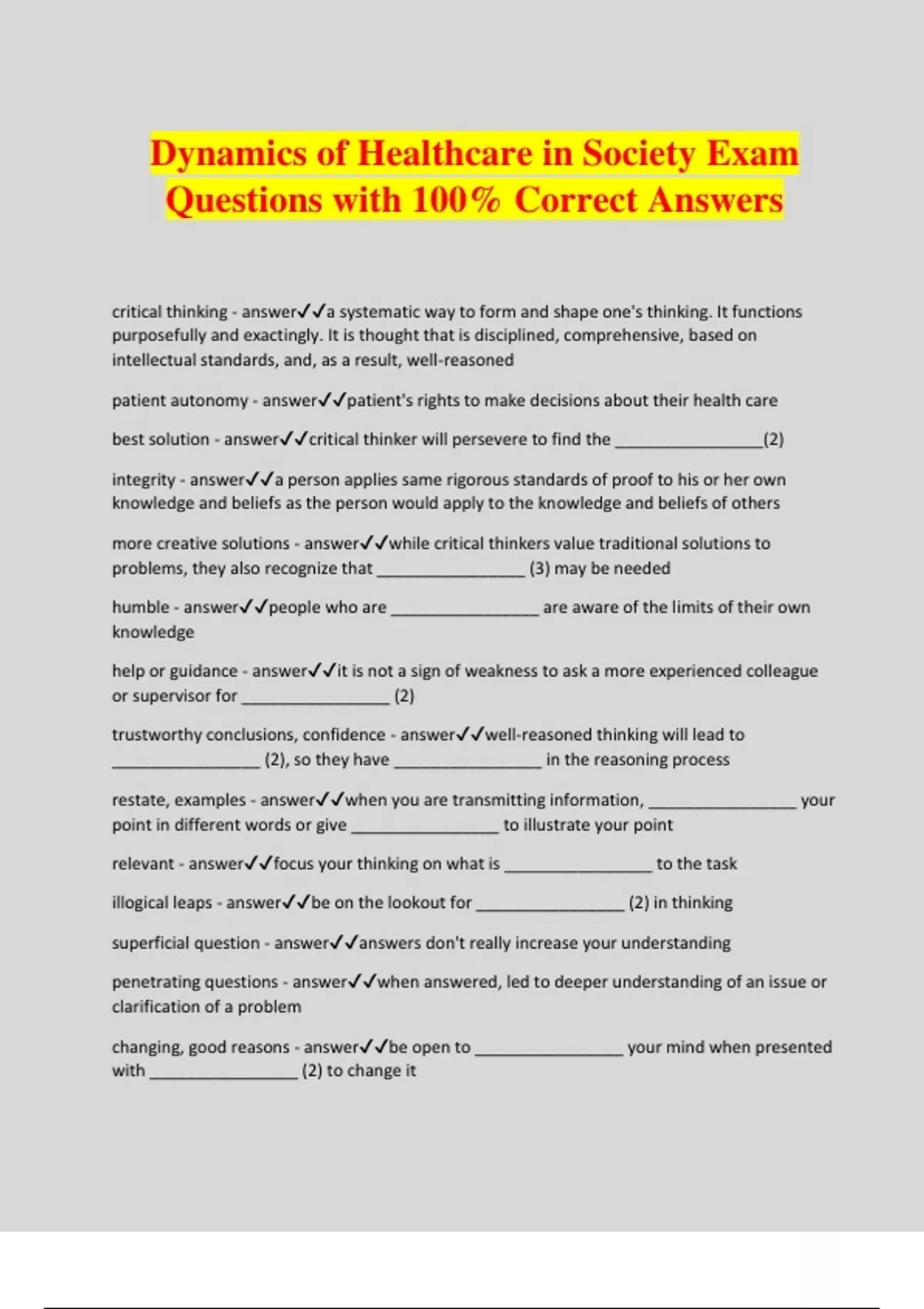 Dynamics of Healthcare in Society Exam Questions with 100% Correct Answers critical thinking - answera systematic way to form and shape one's thinking. It functions purposefully and exactingly. It is thought that is disciplined, comprehensive, based on intellectual standards, and, as a result, well-reasoned patient autonomy - answerpatient's rights to make decisions about their health care best solution - answercritical thinker will persevere to find the ________________(2) integrity - answera person applies same rigorous standards of proof to his or her own knowledge and beliefs as the person would apply to the knowledge and beliefs of others more creative solutions - answerwhile critical thinkers value traditional solutions to problems, they also recognize that ________________ (3) may be needed humble - answerpeople who are ________________ are aware of the limits of their own knowledge help or guidance - answerit is not a sign of weakness to ask a more experienced colleague or supervisor for ________________ (2) trustworthy conclusions, confidence - answerwell-reasoned thinking will lead to ________________ (2), so they have ________________ in the reasoning process restate, examples - answerwhen you are transmitting information, ________________ your point in different words or give ________________ to illustrate your point relevant - answerfocus your thinking on what is ________________ to the task illogical leaps - answerbe on the lookout for ________________ (2) in thinking superficial question - answeranswers don't really increase your understanding penetrating questions - answerwhen answered, led to deeper understanding of an issue or clarification of a problem changing, good reasons - answerbe open to ________________ your mind when presented with ________________ (2) to change it identify the problem - answerYou begin by clearly defining the problem, so that you and the patient are focused on the same issue. gather information and identify possible solutions - answerYou need to gather all the pertinent data. Get all the facts that you can that relate to this situation. This step may take some time, but it will lay a solid foundation for your decision-making process. Collect data that can help you solve the problem, brainstorming - answerencourages people to generate creative thoughts spontaneously Selecting the best option - answerChoose the course of action that will provide the greatest chance for success. Consider the short- and long-term effects of each idea. Implementing the Solution - answerSome solutions provide immediate results, and some take a while to show results, so be sure to give the solution enough time to work. Evaluate the results - answerAfter allowing time for the solution to work, reassess the situation. Trial and error problem solving - answertesting any number of solutions until one is found that solves a particular problem, Scientific problem solving - answer- systematic problem-solving process - more complex version of basic-problem solving method - used in controlled laboratory settings to carry out experiments intuitive problem solving - answerwhen a person instinctively, without logical thinking, identifies a solution to a problem based on its similarity or dissimilarity to other problems distractions - answerYou need a good place to study, free of ________________ large - answerthe area should be ________________ enough to arrange all study materials lighting, temperature, and surroundings. - answerTo choose a good study area, you also need to think about the ________________(3) distracting - answerbeing too cold is ________________ comfortable - answermost people want to be ________________ when studying heat stress, mental sharpness, drowsiness - answerbeing too hot can cause ________________(2), which impairs ________________(2), and can lead to ________________ 65 and 70 - answerfor studying, the best temperature is between ________________