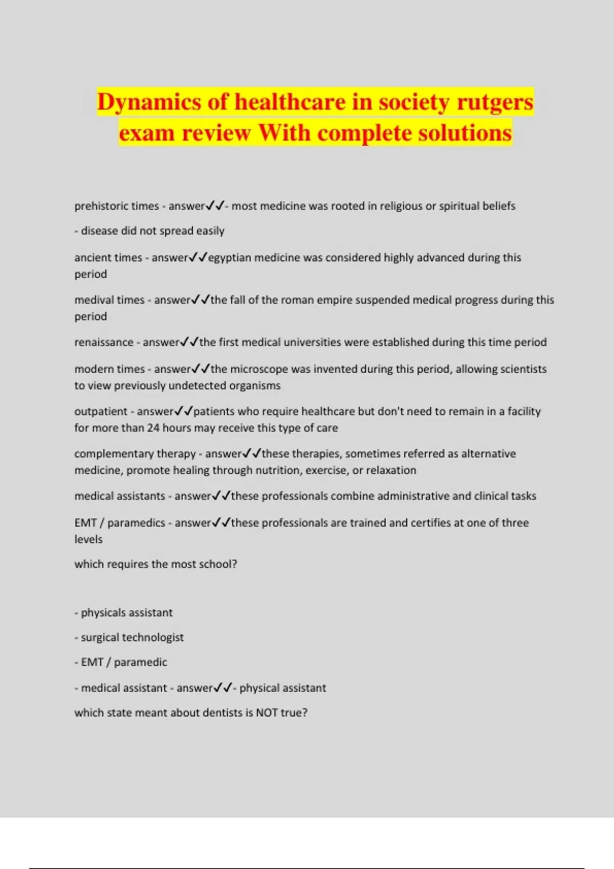 Dynamics of healthcare in society rutgers exam review With complete solutions prehistoric times - answer- most medicine was rooted in religious or spiritual beliefs - disease did not spread easily ancient times - answeregyptian medicine was considered highly advanced during this period medival times - answerthe fall of the roman empire suspended medical progress during this period renaissance - answerthe first medical universities were established during this time period modern times - answerthe microscope was invented during this period, allowing scientists to view previously undetected organisms outpatient - answerpatients who require healthcare but don't need to remain in a facility for more than 24 hours may receive this type of care complementary therapy - answerthese therapies, sometimes referred as alternative medicine, promote healing through nutrition, exercise, or relaxation medical assistants - answerthese professionals combine administrative and clinical tasks EMT / paramedics - answerthese professionals are trained and certifies at one of three levels which requires the most school? - physicals assistant - surgical technologist - EMT / paramedic - medical assistant - answer- physical assistant which state meant about dentists is NOT true? - most specialize in a certain area of care - dentists need to be good business managers - a typical dentists has 6-8 years of college or professional education - the professional organization for dentists is the ADA - answer- most specialize in a certain area of care which statement about pharmacy technicians is NOT true? - they work under the supervision of a licensed pharmacist - the prescriptions they fill do not need to be checked - they can accept written prescriptions and those sent electronically - certification is optional - answer- the prescriptions they fill do not need to be checked which is NOT a task the pharmacists may perform? - write prescriptions - fill prescriptions - plan, monitor, and evaluate drug treatment plan - develop and test new drugs - answer- write prescriptions medical assistant - answerassists with physical exams physician assistant - answerperforms a comprehensive physical exam EMT-paramedic - answerrequires study of advanced life support tasks this HCP provides direct patient care under the direction of a RN or physician - EMT - phlebotomist - coding specialist - LPN - answer- LPN