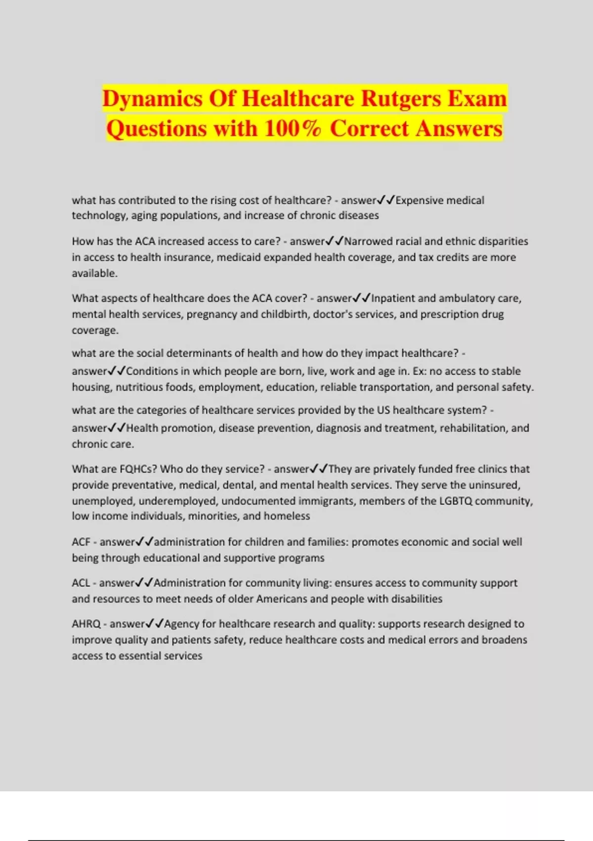 Dynamics Of Healthcare Rutgers Exam Questions with 100% Correct Answers what has contributed to the rising cost of healthcare? - answerExpensive medical technology, aging populations, and increase of chronic diseases How has the ACA increased access to care? - answerNarrowed racial and ethnic disparities in access to health insurance, medicaid expanded health coverage, and tax credits are more available. What aspects of healthcare does the ACA cover? - answerInpatient and ambulatory care, mental health services, pregnancy and childbirth, doctor's services, and prescription drug coverage. what are the social determinants of health and how do they impact healthcare? - answerConditions in which people are born, live, work and age in. Ex: no access to stable housing, nutritious foods, employment, education, reliable transportation, and personal safety. what are the categories of healthcare services provided by the US healthcare system? - answerHealth promotion, disease prevention, diagnosis and treatment, rehabilitation, and chronic care. What are FQHCs? Who do they service? - answerThey are privately funded free clinics that provide preventative, medical, dental, and mental health services. They serve the uninsured, unemployed, underemployed, undocumented immigrants, members of the LGBTQ community, low income individuals, minorities, and homeless ACF - answeradministration for children and families: promotes economic and social well being through educational and supportive programs ACL - answerAdministration for community living: ensures access to community support and resources to meet needs of older Americans and people with disabilities AHRQ - answerAgency for healthcare research and quality: supports research designed to improve quality and patients safety, reduce healthcare costs and medical errors and broadens access to essential services ATSDR - answeragency for toxic substance and disease registry: Prevents exposure to toxic substances and the adverse health effects and diminished quality of life associated with exposure from waste sites, unplanned releases and other sources of environmental pollution. CDC - answercenter for disease control and prevention: coordinates the team of healthcare workers at the city and state levels across the country during an epidemic. Protects the public health of the nations by providing leadership and direction. CMS - answerCenters for Medicare and Medicaid services: combines oversight of the medicare program, the federal portion of the medicaid program and state children's health insurance program, the health insurance marketplace and related quality-assurance activities. FDA - answerFood and drug administration: ensures that food is safe, pure and wholesome. WHO - answerWorld Health Organization: Uses leadership to prevent diseases for the UN IHS - answerIndian Health service: provides american indians and alaska natives with comprehensive health services by developing and managing programs to meet their health needs NIH - answerNational institute of health: Supports biomedical and behavioral research in the US and abroad, conducts research in its own laboratories and clinics, trains promising young researchers, and promotes collecting and sharing medical knowledge. what are the aspects of the patient care partnership? - answerIt lists the responsibilities of hospital and staff toward patients and family. A major point highlighted is informed consent How are public healthcare systems funded? - answerlocal, state, and federal government which populations are covered under Medicare? what coverage does medicare provide? - answerMedicare covers the elderly (65 and older) and people with end stage renal disease, special disabilities, and ALS. How do hospitals use DRGs for billing? - answerA set payment for categories that are used tot classify patients for the purpose of hospital reimbursement with a fixed fee regardless of the actual cost and that are based on the diagnosis, surgical procedure used, age of patient and expected length of stay. what are copays and how do they impact costs to the healthcare system? - answerA copayment shares the cost for healthcare services not covered by health insurance. What are deductibles and how do they impact costs to the healthcare system? - answerA deductible is the dollar amount paid out of pocket for health-care services before health insurance will cover the cost.