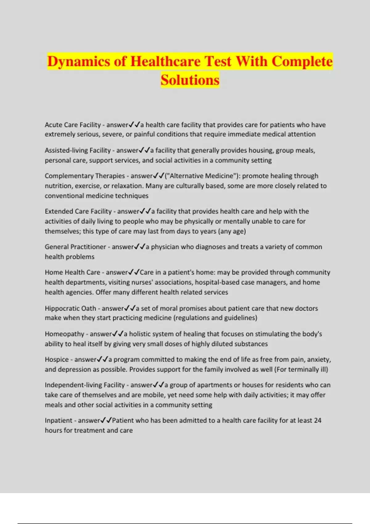 Dynamics of Healthcare Test With Complete Solutions Acute Care Facility - answera health care facility that provides care for patients who have extremely serious, severe, or painful conditions that require immediate medical attention Assisted-living Facility - answera facility that generally provides housing, group meals, personal care, support services, and social activities in a community setting Complementary Therapies - answer("Alternative Medicine"): promote healing through nutrition, exercise, or relaxation. Many are culturally based, some are more closely related to conventional medicine techniques Extended Care Facility - answera facility that provides health care and help with the activities of daily living to people who may be physically or mentally unable to care for themselves; this type of care may last from days to years (any age) General Practitioner - answera physician who diagnoses and treats a variety of common health problems Home Health Care - answerCare in a patient's home: may be provided through community health departments, visiting nurses' associations, hospital-based case managers, and home health agencies. Offer many different health related services Hippocratic Oath - answera set of moral promises about patient care that new doctors make when they start practicing medicine (regulations and guidelines) Homeopathy - answera holistic system of healing that focuses on stimulating the body's ability to heal itself by giving very small doses of highly diluted substances Hospice - answera program committed to making the end of life as free from pain, anxiety, and depression as possible. Provides support for the family involved as well (For terminally ill) Independent-living Facility - answera group of apartments or houses for residents who can take care of themselves and are mobile, yet need some help with daily activities; it may offer meals and other social activities in a community setting Inpatient - answerPatient who has been admitted to a health care facility for at least 24 hours for treatment and care Interdisciplinary Team - answera group of health care professionals with varied medical educations, backgrounds, and experiences who work together to deliver the best possible care for each patient Microbiology - answerthe branch of biology that studies microorganisms and their effects on humans Outpatient - answera patient who is discharged within 23 hours, but may require ongoing treatment, care, and education Pandemic - answeran infectious disease that affects entire continents or even the world Prognosis - answera medical opinion about the likely outcome of a condition or disease Rehabilitation Centers - answerProvide services for patients needing physical or emotional rehabilitation or treatment of chemical dependency. (can be associated with a hospital or be its own independent agency) Sphygmomanometer - answer(BLOOD PRESSURE CUFF): measures blood pressure Stethoscope - answerinstrument used for listening to internal body sounds of a patient Subacute Care Facility - answera health care facility that fills the gap between hospitalization and rehabilitation, by providing care to patients who are stable and don't need acute care, yet need more complex treatment than can be found in a nursing or rehabilitation facility. Care for a variety of patients with complex and rehabilitative needs. Most medicine was rooted in religious or spiritual beliefs during this period, and disease did not spread easily - answerPrehistoric Egyptian medicine was considered highly advanced during this period - answerAncient times The fall of the Roman Empire suspended medical progress during this period. - answerMedieval Times The microscope was invented during this period, allowing scientists to view previously undetected organisms - answerModern times The study of microogranisms - answermicroorganisms Patients who require health care but don't need to remain in a facility more than 24 hours may receive this type of care - answeroutpatient These health care professionals are trained to assist physicians or other medical providers in clinical or administrative procedures - answerMedical assistants and physician assistants This healthcare professional provides direct patient care under the direction of a registered nurse (RN) or physician - answerLicensed practical nurse (LPN) Hippocrates dismissed the idea that illnesses were caused by supernatural forces. instead, what idea did he emphasize? - answerPrognosis What important role did Florence Nightingale play in medical history? - answerShe was the founder of modern day nursing. She stressed the importance of hygiene and sanitation Accreditation - answerprocess by which an educational program is evaluated and then recognized as having met certain predetermined standards of education Licensure - answerthe state government grants authority to individuals to work in that profession within a certain state Registration - answermeans that an individual has graduated from an accredited school and have passed a standardized national exam administered by a nongovernmental agency. Certification - answerdemonstrates that a health care worker meets the requirements set by the certifying organization to demonstrate mastery of the job Career Ladder - answerA sequence that shows work from an entry to advanced level; the hierarchy of careers within a field Diagnostic Services - answerdetermine the presence, absence, or extent of disease and provide data on the effectiveness of treatment Biotechnology - answerThe manipulation of genetic material in living organisms, or parts of living organisms, to make useful products or services. Support Services - answerprovide care either directly or indirectly or create a therapeutic environment for providing health care: biomedical engineering, industrial hygienists Therapeutic Services - answerhealth care services that provide treatment for patients or animals and may also help clients to maintain or improve 