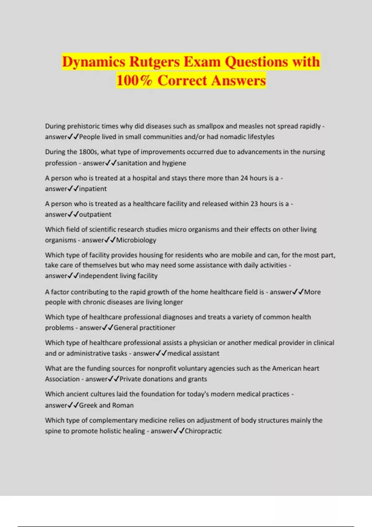 Dynamics Rutgers Exam Questions with 100% Correct Answers During prehistoric times why did diseases such as smallpox and measles not spread rapidly - answerPeople lived in small communities and/or had nomadic lifestyles During the 1800s, what type of improvements occurred due to advancements in the nursing profession - answersanitation and hygiene A person who is treated at a hospital and stays there more than 24 hours is a - answerinpatient A person who is treated as a healthcare facility and released within 23 hours is a - answeroutpatient Which field of scientific research studies micro organisms and their effects on other living organisms - answerMicrobiology Which type of facility provides housing for residents who are mobile and can, for the most part, take care of themselves but who may need some assistance with daily activities - answerindependent living facility A factor contributing to the rapid growth of the home healthcare field is - answerMore people with chronic diseases are living longer Which type of healthcare professional diagnoses and treats a variety of common health problems - answerGeneral practitioner Which type of healthcare professional assists a physician or another medical provider in clinical and or administrative tasks - answermedical assistant What are the funding sources for nonprofit voluntary agencies such as the American heart Association - answerPrivate donations and grants Which ancient cultures laid the foundation for today's modern medical practices - answerGreek and Roman Which type of complementary medicine relies on adjustment of body structures mainly the spine to promote holistic healing - answerChiropractic Which type of healthcare facility provides acute care - answerHospital Which type of healthcare facility provide specialized care for patients recovering from injuries, serious illnesses, drug dependency, or emotional problems - answerRehabilitative Which type of healthcare facility or service provides care focus on pain reduction, stress relief, and quality of life for patients with terminal illnesses - answerHospice which healthcare field focuses on conducting tests on body tissues, fluids, and cells to determine the cause or progression of an illness - answerClinical laboratory Which medical instrument is used to measure blood pressure - answersphygmomanometer What is an inter-disciplinary healthcare team - answerOne that includes professionals with different backgrounds, specialties, and levels of medical education who work together to provide patient care What is a prognosis? - answerA medical opinion regarding the probable course and outcome of a disease True or false the Hippocratic oath serves as a legal doctrine guiding the medical profession - answerfalse it's not legal True or false all hospitals are publicly funded - answerForce not all A person who draws blood sample for testing - answerphlebotomists A person who might do an ultrasound scan of the lungs - answerDiagnostic medical sonographer The following is not involved in speech and hearing testing - answerOphthalmologist Which nursing occupation requires an Associates or bachelors of science degree - answerRegistered nurse Which of the following requires the highest level of training - answerparamedic What is the biggest difference between a technician and a technologist - answertechnologists have bachelors degrees Which career in therapeutic services she has the most tasks with a physician - answerphysicians assistant Which of the following would not be directly involved in the treatment of an amputee - answerchiropractor of the following dental occupations, which one custom designs dental prostheses such as crowns and dentures - answerdental lab assistant Which of the following does not require a bachelors degree - answerLaboratory assistant Which of the following would be handled by a pathologist - answerblood samples, biopsy or tissue sample, dead body ALL OF THE ABOVE Which of the following signifies an individual has passed a standardize national exam administered by a professional organization - answerregistration Which of the following signifies that a state government has granted authority for an individual to practice in a certain professions - answerlicensure Which of the following signifies an individual has met the requirements of a professional organization and has demonstrated mastery of a certain profession - answerCertification Which of the following is a group of professions that involves providing healthcare to human or animal patients - answertherapeutic services Qualifications or achievements used to indicate a person suitability for a job or professional role or his or her - answerCredentials How many occupations or career specialties are available within the general field of healthcare - answerMore than 300 Which healthcare related field use his biological substances or micro organisms to perform industrial or engineer in task that may result in new products and services - answerBio technology Which health professional performance many of the same examination diagnostic and treatment tasks as physicians but must be serviced by a physician - answerphysician assistant A median salary for a given profession is a number that reflects - answerA mid range salary for professionals in that field Which health professional implement a treatment plan created by a physical therapist - answerPhysical therapist assistant Which health professional designs, makes, and custom fit artificial limbs and orthopedic devices - answerorthotist/prosthetist