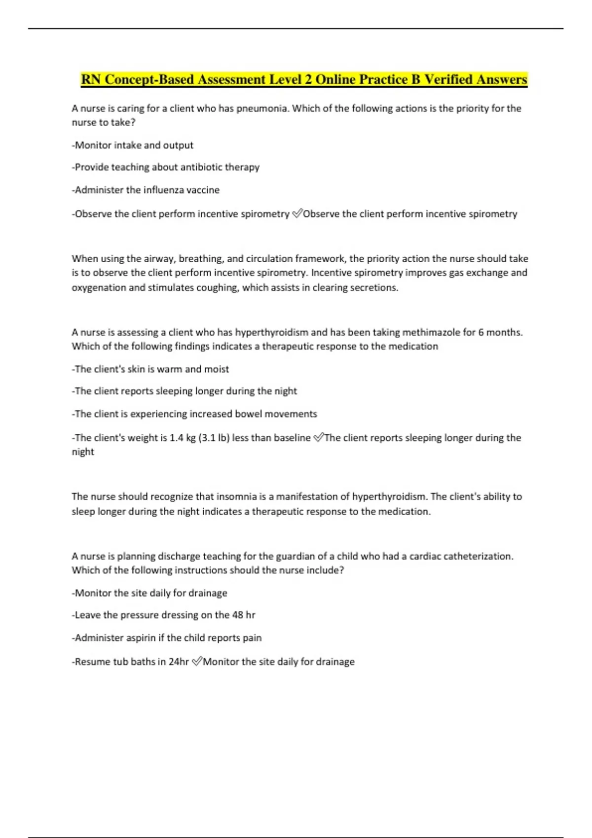 RN Concept-Based Assessment Level 2 Online Practice B Verified Answers A nurse is caring for a client who has pneumonia. Which of the following actions is the priority for the nurse to take? -Monitor intake and output -Provide teaching about antibiotic therapy -Administer the influenza vaccine -Observe the client perform incentive spirometry Observe the client perform incentive spirometry When using the airway, breathing, and circulation framework, the priority action the nurse should take is to observe the client perform incentive spirometry. Incentive spirometry improves gas exchange and oxygenation and stimulates coughing, which assists in clearing secretions. A nurse is assessing a client who has hyperthyroidism and has been taking methimazole for 6 months. Which of the following findings indicates a therapeutic response to the medication -The client's skin is warm and moist -The client reports sleeping longer during the night -The client is experiencing increased bowel movements -The client's weight is 1.4 kg (3.1 lb) less than baseline The client reports sleeping longer during the night The nurse should recognize that insomnia is a manifestation of hyperthyroidism. The client's ability to sleep longer during the night indicates a therapeutic response to the medication. A nurse is planning discharge teaching for the guardian of a child who had a cardiac catheterization. Which of the following instructions should the nurse include? -Monitor the site daily for drainage -Leave the pressure dressing on the 48 hr -Administer aspirin if the child reports pain -Resume tub baths in 24hr Monitor the site daily for drainage The nurse should instruct the guardian to monitor the site daily for manifestations of infection, such as drainage, redness, and swelling. The guardian should report these findings to the provider. A nurse is reviewing the medical record of a client who is receiving total parenteral nutrition for a malabsorption disorder. Which of the following findings should the nurse identify as an indication that the client's nutritional status is improving? -Intake of fluid is less than output of urine over the past 2 days -1kg (2.2 lb) weight gain over the past 2 days -Blood glucose 206 mg/dL -Prealbumin 13 mg/dL 1 kg (2.2 lb) weight gain over the past 2 days Total parenteral nutrition is administered to clients who have inflammatory bowel disorders and are unable to tolerate enteral nutrition. A weight gain of 0.5 kg (1.1 lb) daily is an indication that the client is responding to the parenteral nutrition. A nurse is performing a focused assessment on a client who has cholelithiasis and reports pain. Which of the following areas should the nurse assess? Right upper quadrant The nurse should assess the gallbladder for the presence of pain or discomfort as a result of biliary colic, which is caused by a gallbladder stone obstructing the bile duct. The pain can radiate from the right upper quadrant of the client's abdomen to the client's right shoulder. The nurse is providing discharge teaching to a client about managing diverticulitis. Which of the following statements should the nurse include in the teaching? -"Use bisacodyl suppositories to stimulate a bowel movement" -"Avoid lifting objects greater than 50 pounds" -"Consume a clear liquid diet until symptoms resolve" -"Take a probiotic 15 minutes after taking a prescribed antibiotic to prevent antibiotic-related diarrhea" "Consume a clear liquid diet until symptoms resolve" The nurse should recommend the client consume a clear liquid diet until manifestations such as abdominal pain, nausea, and vomiting have resolved. A clear liquid diet is low in fiber and does not stimulate intestinal motility. A nurse is providing teaching to a client who has a methicillin-resistant Staphylococcus aureus (MRSA) skin infection. Which of the following client statements indicates an understanding of the management of antibiotic resistant infections? -I will keep the infected area open to air to help it heal -I can sleep in the same bed as my partner after I have been taking antibiotics for 24 hours -I should sit on upholstered chairs instead of hardback chairs -I will wash all uninfected skin areas with a fresh washcloth I will wash all uninfected skin areas with a fresh washcloth The nurse should instruct the client to wash the uninfected skin areas with a fresh washcloth to prevent contamination of the unaffected areas of the skin with the MRSA infection. A nurse is providing teaching to a client about preventing hearing loss from trauma. Which of the following instructions should the nurse include in the teaching? -Keep your mouth open when sneezing -Block one nostril when blowing your nose -Use an ear wick candle to remove excess cerumen from the canal -Lubricate cotton-tipped applicators with mineral oil to clean the ear canal Keep your mouth ope