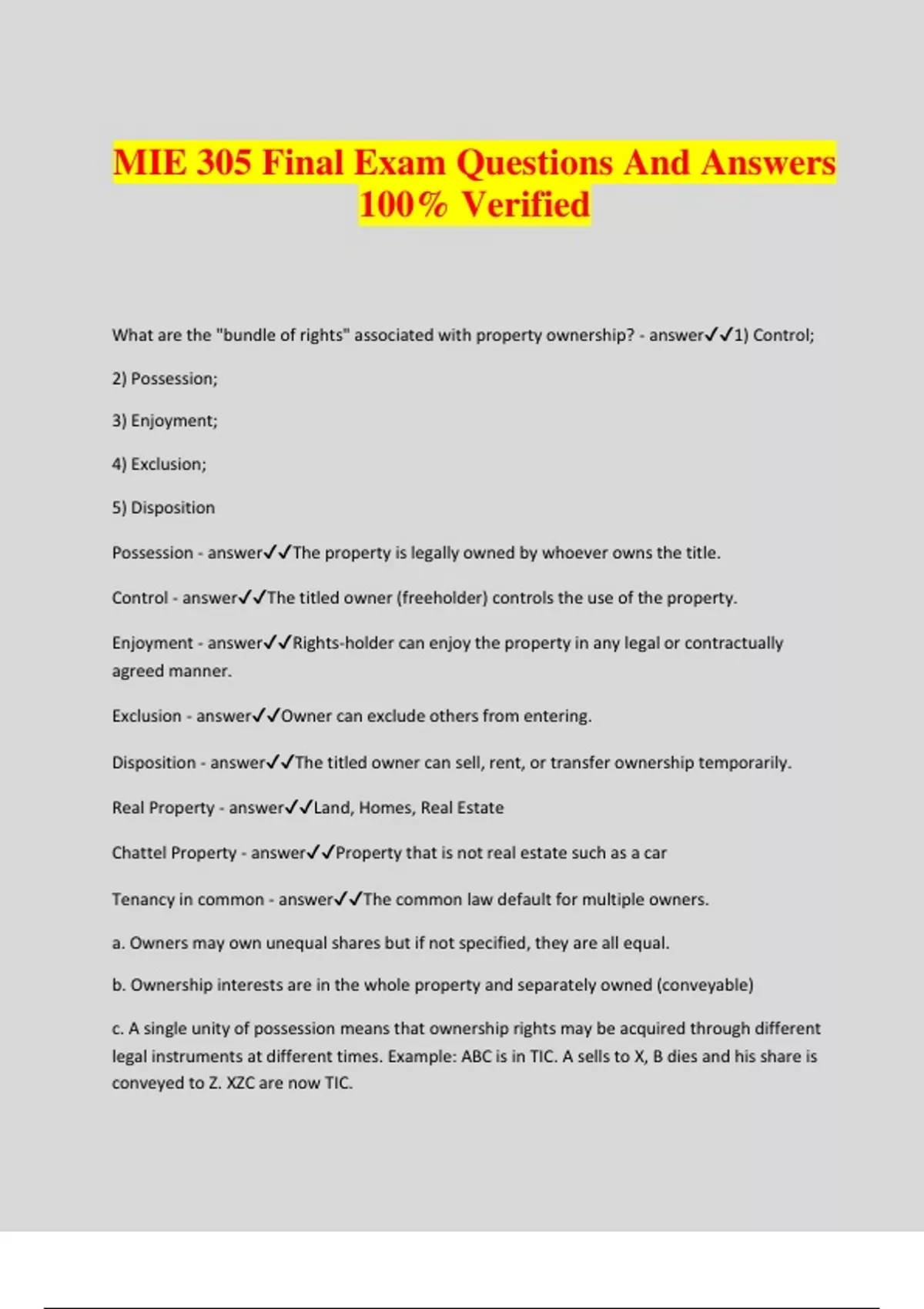 MIE 305 Final Exam Questions And Answers 100% Verified What are the "bundle of rights" associated with property ownership? - answer1) Control; 2) Possession; 3) Enjoyment; 4) Exclusion; 5) Disposition Possession - answerThe property is legally owned by whoever owns the title. Control - answerThe titled owner (freeholder) controls the use of the property. Enjoyment - answerRights-holder can enjoy the property in any legal or contractually agreed manner. Exclusion - answerOwner can exclude others from entering. Disposition - answerThe titled owner can sell, rent, or transfer ownership temporarily. Real Property - answerLand, Homes, Real Estate Chattel Property - answerProperty that is not real estate such as a car Tenancy in common - answerThe common law default for multiple owners. a. Owners may own unequal shares but if not specified, they are all equal. b. Ownership interests are in the whole property and separately owned (conveyable) c. A single unity of possession means that ownership rights may be acquired through different legal instruments at different times. Example: ABC is in TIC. A sells to X, B dies and his share is conveyed to Z. XZC are now TIC. Joint Tenancy with right of survivorship - answera. Single undivided interest - property belongs to all; not individually conveyable. b. Ownership interest must be equal among all owners (no unequal shares). c. Right of survivorship precludes conveyance by legal instruments or acts. d. JTs require four unities to be valid. 1: JTS must acquire ownership at the same time. 2: JTS must acquire ownership through the same document or grant. 3: JTS must have identical interests in the property and they must all have it for the same duration of time. 4: JTS must all have rights to possess and use the entire undivided property. "Twist on Inseparable Joint Tenancy interests" - answera. Severance occurs if a JT in a transaction breaks these unities by a JT converting their share of the property. b. If a new owner comes because someone dies, they become a tenancy in common to the other joint tenants. What is the default form of co-ownership if non is specifically state in conveyance? - answerTIC Regarding joint tenancy with right of survivorship, what happens if ABC own a property and C dies? - answerC's share goes to A & B who now equally share the property. How does severance work with right of survivorship? ABC are JTs, C dies leaving C's share to X. - answerA and B are Joint Tenants while X owns 1/3 of the property. What are the four unities of joint tenancy for it to be valid? - answer1) JTs must acquire ownership at the same time. 2) HTs must acquire their ownership through the same document or grant. 3) JTs must have identical interest in the property and they must all have it for the same duration. 4) JTs must all have rights to possess and use the entire undivided property.
