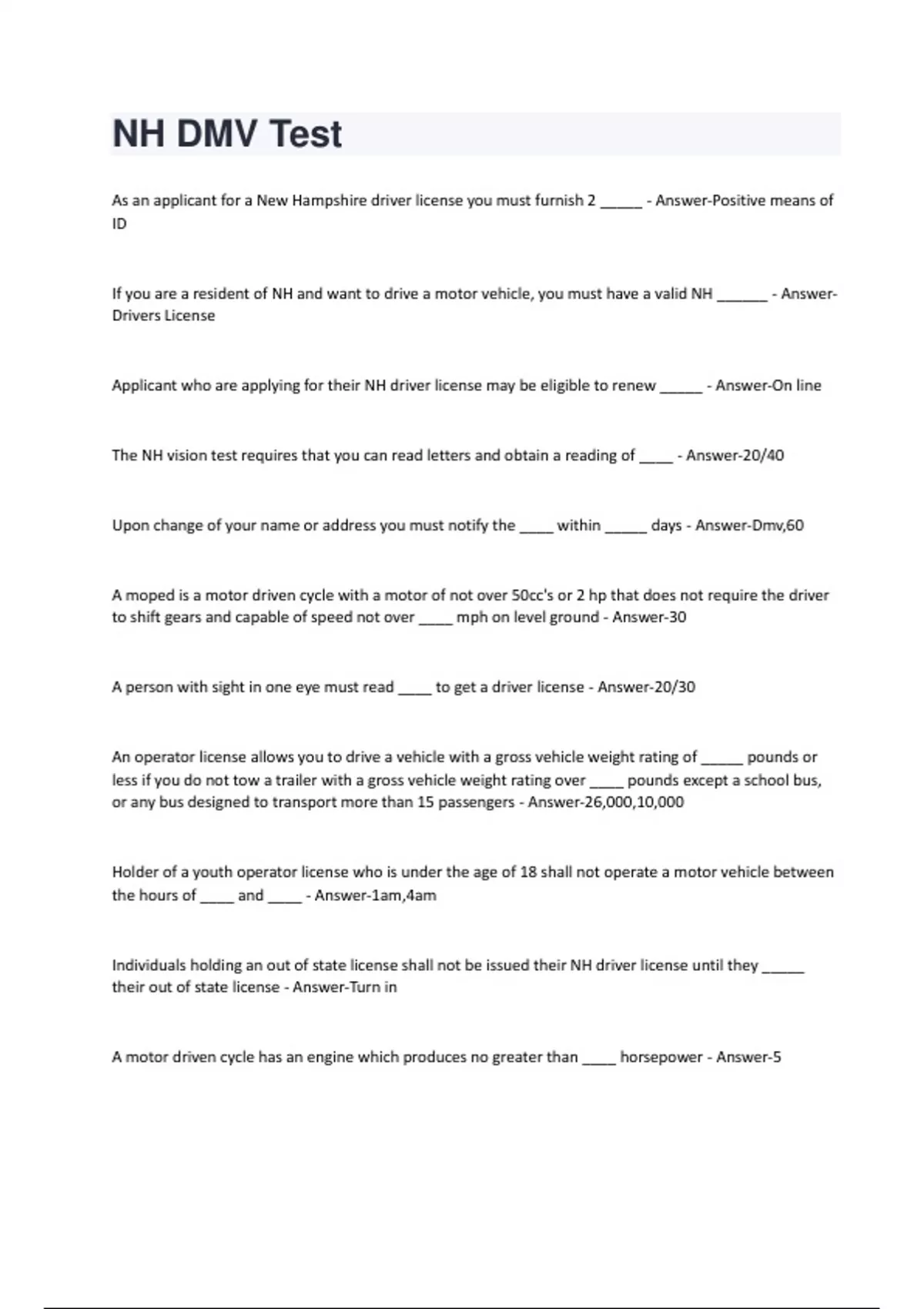 As an applicant for a New Hampshire driver license you must furnish 2 _____ - Answer-Positive means of ID If you are a resident of NH and want to drive a motor vehicle, you must have a valid NH ______ - AnswerDrivers License Applicant who are applying for their NH driver license may be eligible to renew _____ - Answer-On line The NH vision test requires that you can read letters and obtain a reading of ____ - Answer-20/40 Upon change of your name or address you must notify the ____ within _____ days - Answer-Dmv,60 A moped is a motor driven cycle with a motor of not over 50cc's or 2 hp that does not require the driver to shift gears and capable of speed not over ____ mph on level ground - Answer-30 A person with sight in one eye must read ____ to get a driver license - Answer-20/30 An operator license allows you to drive a vehicle with a gross vehicle weight rating of _____ pounds or less if you do not tow a trailer with a gross vehicle weight rating over ____ pounds except a school bus, or any bus designed to transport more than 15 passengers - Answer-26,000,10,000 Holder of a youth operator license who is under the age of 18 shall not operate a motor vehicle between the hours of ____ and ____ - Answer-1am,4am Individuals holding an out of state license shall not be issued their NH driver license until they _____ their out of state license - Answer-Turn in A motor driven cycle has an engine which produces no greater than ____ horsepower - Answer-5A "B" restriction on a NH driver license means that the driver must wear ____ - Answer-Corrective lenses An "E" restriction on a NH driver license means that an _____ must be used - Answer-Automatic transmission New residents are allowed ____ days to register their vehicles in NH - Answer-10 To operate a motorcycle you must have a _____ - Answer-Motorcycle license What is he youngest age one may legally practice drive in NH? - Answer-15 1/2 One who is practice driving must be accompanied in the front seat by a licensed driver who is at least ____ - Answer-25 Vehicles except heavy trucks do not need a title if they are more than ___ years old - Answer-15 A legal document showing legal ownership of a vehicle is called a ____ - Answer-Title If a vehicle is purchased through a private sale, how does one apply for a title? - Answer-City clerk In the case of all private passenger vehicles registered by an individual, the registration expertise annually on ____ - Answer-Birth month To register a motor vehicle in Nh you must first pay the municipal fee at the town/city ____ office - Answer-Clerks A privately owned motor vehicle must be inspected ______ on the owners _____ - Answer-Once a year,birth month The foot brake must be capable of stopping a vehicle going 20 mph within ___ feet - Answer-30No tire is in safe operating condition where less that ____ inch of tread design remains in the tire - Answer-2/32 Your safety belt will keep you from being ___ thereby helping you to maintain control of the vehicle - Answer-Moved around You are ____ times more likely to survive a rollover if you have your safety belt on. - Answer-5 NH law requires youngsters to wear a safety belt until they are ____ years okd - Answer-18 NH law requires motorcyclists to wear an approved protective helmet until they are ____ years okd - Answer-18 Right turns on a red light are permitted after a stop except when _____ - Answer-There is a sign prohibiting it,pedestrians, and traffic coming An eight sided octagonal sign always means ____ - Answer-Stop