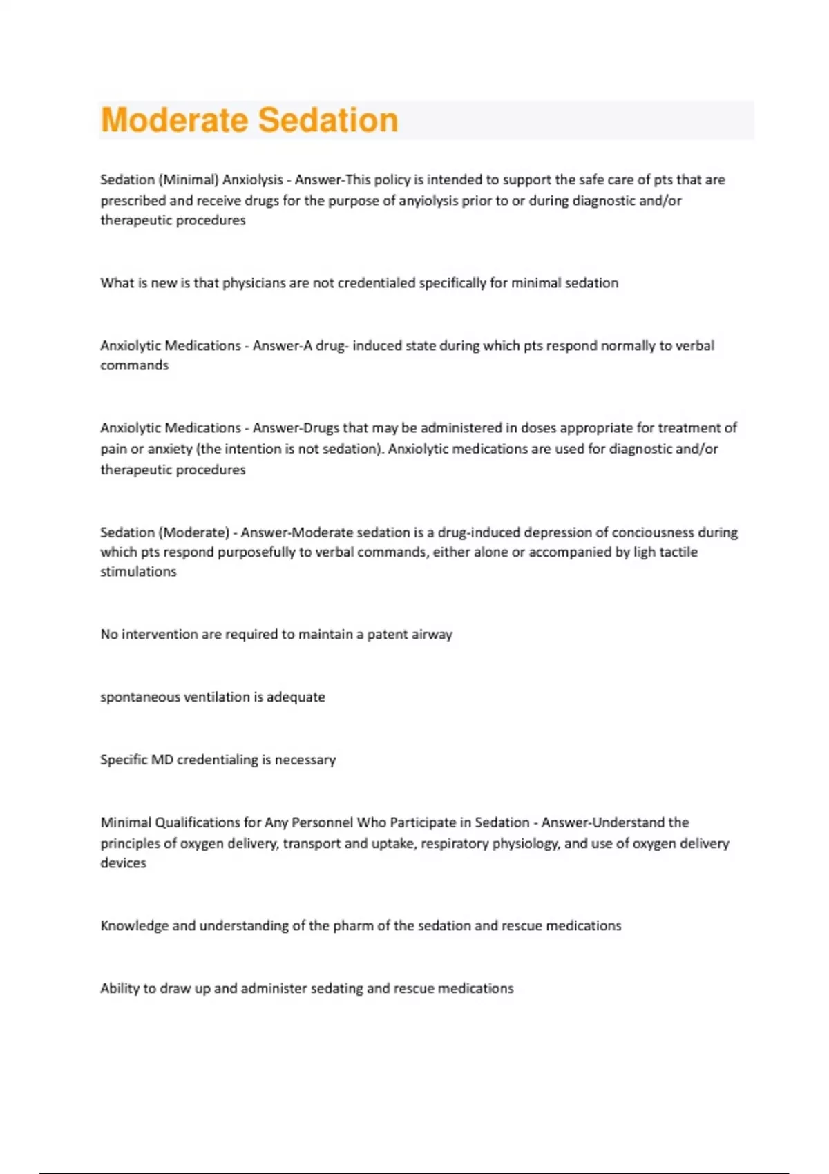 Sedation (Minimal) Anxiolysis - Answer-This policy is intended to support the safe care of pts that are prescribed and receive drugs for the purpose of anyiolysis prior to or during diagnostic and/or therapeutic procedures What is new is that physicians are not credentialed specifically for minimal sedation Anxiolytic Medications - Answer-A drug- induced state during which pts respond normally to verbal commands Anxiolytic Medications - Answer-Drugs that may be administered in doses appropriate for treatment of pain or anxiety (the intention is not sedation). Anxiolytic medications are used for diagnostic and/or therapeutic procedures Sedation (Moderate) - Answer-Moderate sedation is a drug-induced depression of conciousness during which pts respond purposefully to verbal commands, either alone or accompanied by ligh tactile stimulations No intervention are required to maintain a patent airway spontaneous ventilation is adequate Specific MD credentialing is necessary Minimal Qualifications for Any Personnel Who Participate in Sedation - Answer-Understand the principles of oxygen delivery, transport and uptake, respiratory physiology, and use of oxygen delivery devices Knowledge and understanding of the pharm of the sedation and rescue medications Ability to draw up and administer sedating and rescue medicationsAbility to recognize a compromised airway Competency to monitor, intervene and assist in the management of complications and institute appropriate interventions in compliance with orders or protocols Competency in vital sign monitoring and assessing LOC Cerified in BLS if assisting with minimal or moderate sedation procedures A person certified in ACLS must be immediately avaible during moderate sedation procedures Certified in ACLS if assisting in DEEP sedation procedures Certified in PALS if assisting with peds moderate sedation procedures Key Principles of Sedation - Answer-Provide adequate sedation while maintaining cardiac and respiratory function Relieve anxiety, enhance pt cooperation Provide relief from pain and other noxious stimuli Duties of Personnel with Moderate Sedation - Answer-Personnel must be dedicated to the following responsibilities during moderate sedation At least one qualified personnel must be present during every procedural sedation A qualified personnel (according to their scope of practice) must assess the pt care requirements before, during and after sedation as defined in the policiesMust monitor VS including BP, HR, RR, O2 sats, level of pain and cardiac rhythm (when monitoring is required) Must monitor the pts LOC May draw up and administer the med for sedation if prescribed by and delegated from a physician or LIP who is immediately available The qualified personnel who is desginated to patient monitoring during the procedure must not leave the pt unattended Sedation - Answer-Sedation is a continuum. Therefore, it is not always possible to predict how an individual pt receiving sedation will respond