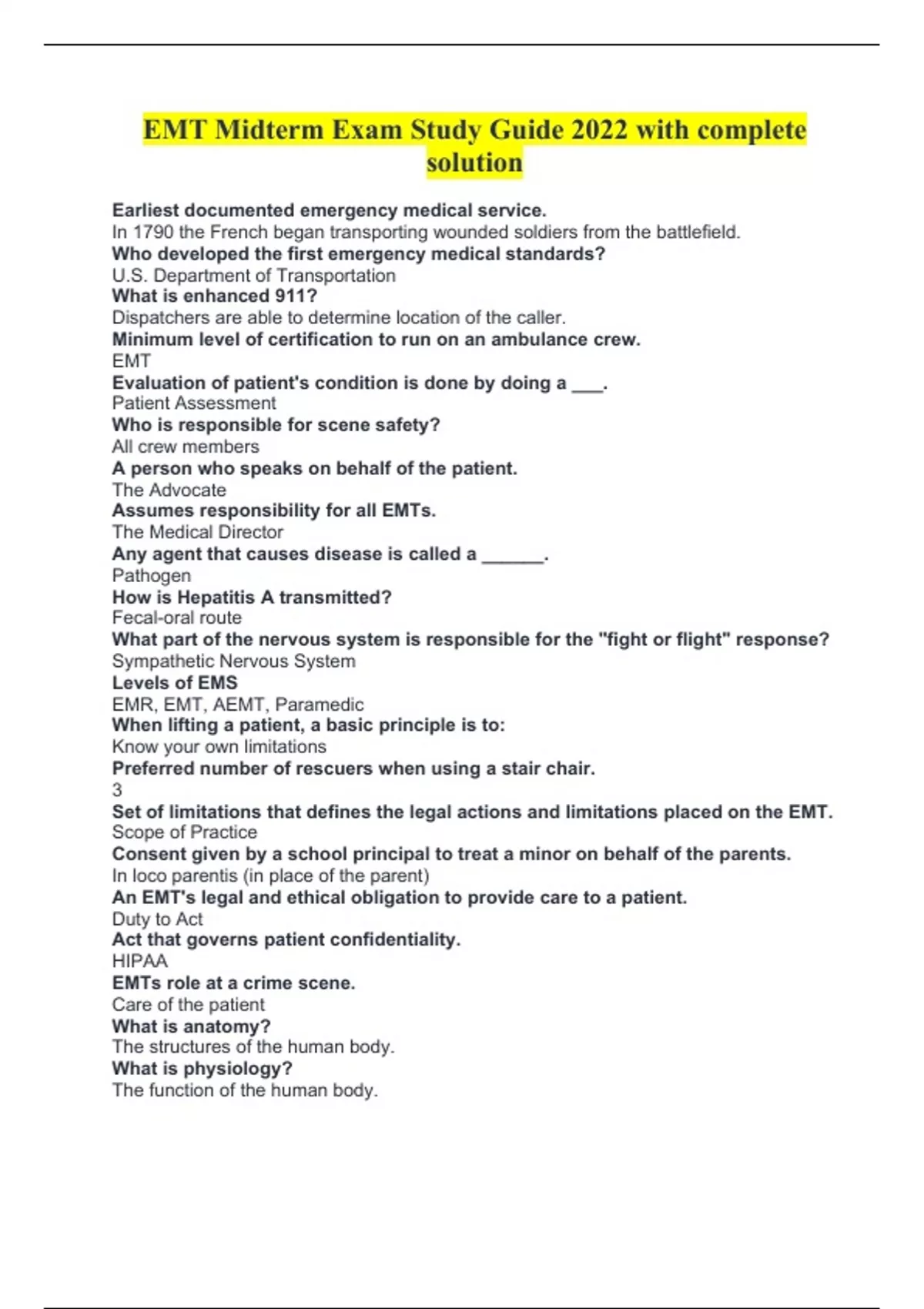 EMT Midterm Exam Study Guide 2022 with complete solution Earliest documented emergency medical service. In 1790 the French began transporting wounded soldiers from the battlefield. Who developed the first emergency medical standards? U.S. Department of Transportation What is enhanced 911? Dispatchers are able to determine location of the caller. Minimum level of certification to run on an ambulance crew. EMT Evaluation of patient's condition is done by doing a ___. Patient Assessment Who is responsible for scene safety? All crew members A person who speaks on behalf of the patient. The Advocate Assumes responsibility for all EMTs. The Medical Director Any agent that causes disease is called a ______. Pathogen How is Hepatitis A transmitted? Fecal-oral route What part of the nervous system is responsible for the "fight or flight" response? Sympathetic Nervous System Levels of EMS EMR, EMT, AEMT, Paramedic When lifting a patient, a basic principle is to: Know your own limitations Preferred number of rescuers when using a stair chair. 3 Set of limitations that defines the legal actions and limitations placed on the EMT. Scope of Practice Consent given by a school principal to treat a minor on behalf of the parents. In loco parentis (in place of the parent) An EMT's legal and ethical obligation to provide care to a patient. Duty to Act Act that governs patient confidentiality. HIPAA EMTs role at a crime scene. Care of the patient What is anatomy? The structures of the human body. What is physiology? The function of the human body. Sharing information about a patient's history or condition. Breach of confidentiality Medial Middle Lateral Outside Standing erect, facing the observer, with arms down and the palms of the hands facing forward. Anatomical Position Prone Face down Supine Face up Proximal Near to Distal Away from Patient is sitting straight up. Fowler's position Shock is also called _____. Hypoperfusion The two areas of the spine most easily injured. Cervical and Lumbar Arteries always carry blood ______ from the heart. away Veins always care blood _____ the heart. towards The clotting components of blood. Platelets The arteries the feed blood to the heart. Coronary arteries The pressure created by the contraction of the left ventricle Systolic The pressure remaining in the arteries when the left ventricle relaxes. Diastolic The system of the body that produces chemicals and hormones that regulate most of the body's activities and functions. Endocrine System Main function of the liver. Detoxifies harmful substances, stores sugar, and assists in the production of blood products. The most muscular and strongest part of the heart. Left Ventricle Primary organs of the renal system. Kidneys Carries deoxygenated blood to the lungs