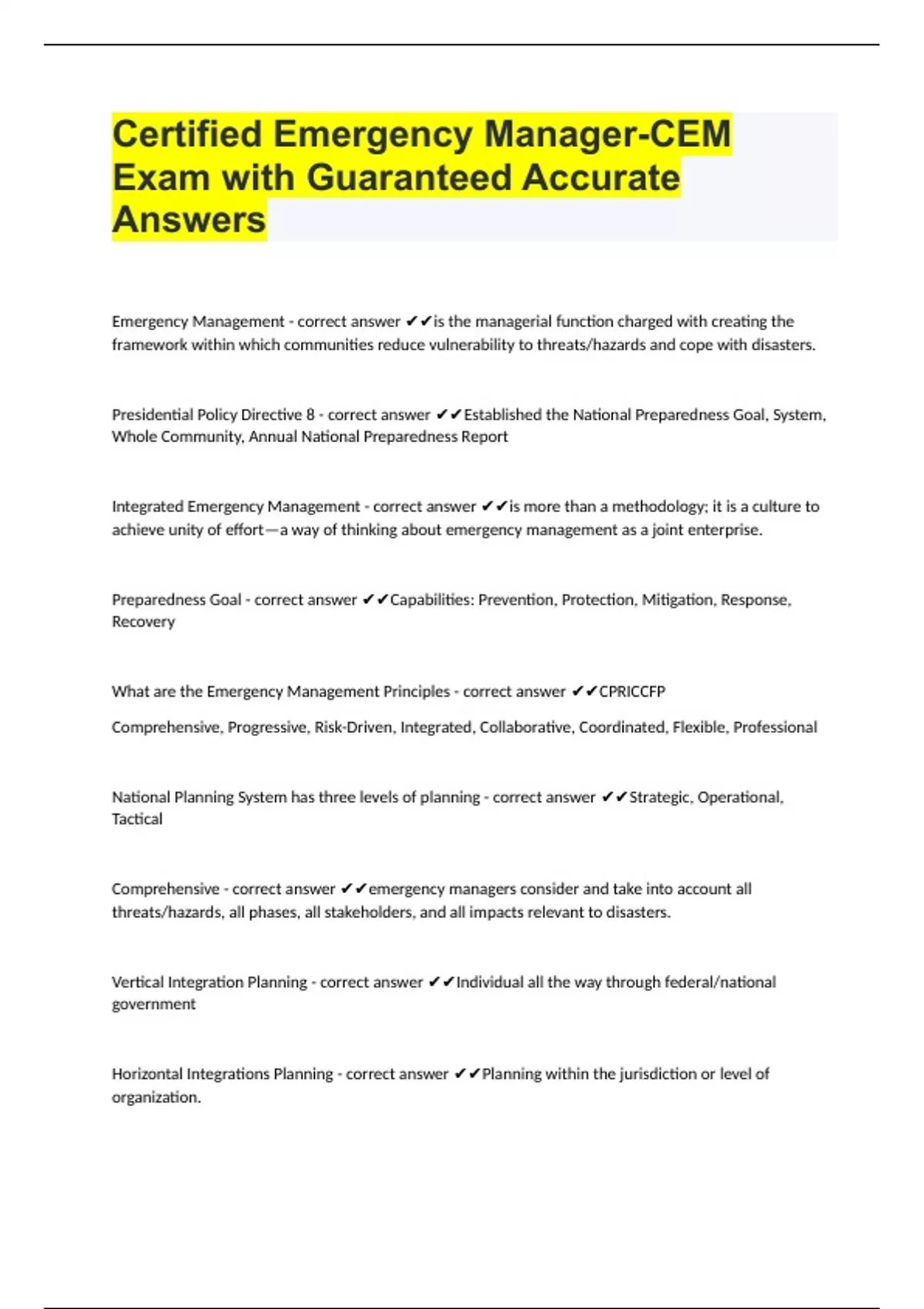 Emergency Management - correct answer is the managerial function charged with creating the framework within which communities reduce vulnerability to threats/hazards and cope with disasters. Presidential Policy Directive 8 - correct answer Established the National Preparedness Goal, System, Whole Community, Annual National Preparedness Report Integrated Emergency Management - correct answer is more than a methodology; it is a culture to achieve unity of effort—a way of thinking about emergency management as a joint enterprise. Preparedness Goal - correct answer Capabilities: Prevention, Protection, Mitigation, Response, Recovery What are the Emergency Management Principles - correct answer CPRICCFP Comprehensive, Progressive, Risk-Driven, Integrated, Collaborative, Coordinated, Flexible, Professional National Planning System has three levels of planning - correct answer Strategic, Operational, Tactical Comprehensive - correct answer emergency managers consider and take into account all threats/hazards, all phases, all stakeholders, and all impacts relevant to disasters. Vertical Integration Planning - correct answer Individual all the way through federal/national government Horizontal Integrations Planning - correct answer Planning within the jurisdiction or level of organization. Progressive - correct answer emergency managers anticipate future disasters and take protective, preventive, and preparatory measures to build disaster-resistant and disaster-resilient communities. Risk-Driven - correct answer emergency managers use sound risk management principles (threat/hazard identification, risk analysis, and impact analysis) in assigning priorities and resources. Operational Planning - correct answer A plan that defines roles and responsibilities, tasks, and actions during emergencies and that focuses on how activities of organizations in the jurisdiction will be coordinated. Integrated - correct answer emergency managers ensure unity of effort among all levels of government and all elements of a community. The Incident Command System (ICS) is? - correct answer Standardized, on-scene, all-risk, incident management concept. ICS is the result of decades of lessons learned in the organization and management of emergency incidents. Collaborative - correct answer Emergency managers create and sustain broad and sincere relationships among individuals and organizations to encourage trust, advocate a team atmosphere, build consensus, and facilitate communication. 1. The term "major or complex incident" may have different meanings to different agencies depending upon the size of the jurisdiction, number of resources available, and other variables. List two characteristics of major or complex incidents: - correct answer Involve more than one agency and/or political jurisdiction Involve complex management and communication issues Require experienced, highly qualified supervisory personnel Require numerous tactical and support resources Involve multiple victims with injuries, fatalities, or illnesses Include widespread damage to property/environment Result in psychological threat/trauma Span multiple operational periods (days, weeks) Are costly to control and mitigate Require extensive recovery efforts Draw national media interest Coordinated - correct answer Emergency managers synchronize the activities of all relevant stakeholders to achieve a common purpose. Designers of the system recognized early that ICS must be interdisciplinary and organizationally flexible to meet the following management challenges - correct answer 1. Meet the needs of the incidents of any kind or size 2. Be usable for routine events or complex emergencies incidents 3. allow personnel from a variety of agencies to meld rapidly into a common management structure. 4. provided logistical and administrative support to ensure that operational staff can meet incident objectives. 5. Be cost effective by avoiding duplication of efforts Flexible - correct answer emergency managers use creative and innovative approaches in solving disaster challenges. 2. The act of directing, ordering, or controlling by virtue of explicit statutory, regulatory, or delegated authority is the definition of: - correct answer (a) Command Professional - correct answer emergency managers value a science- and knowledge-based approach based on education, training, experience, ethical practice, public stewardship, and continuous improvement. Poorly managed incident response can be devastating to our? - correct answer Economy, to our food supply a