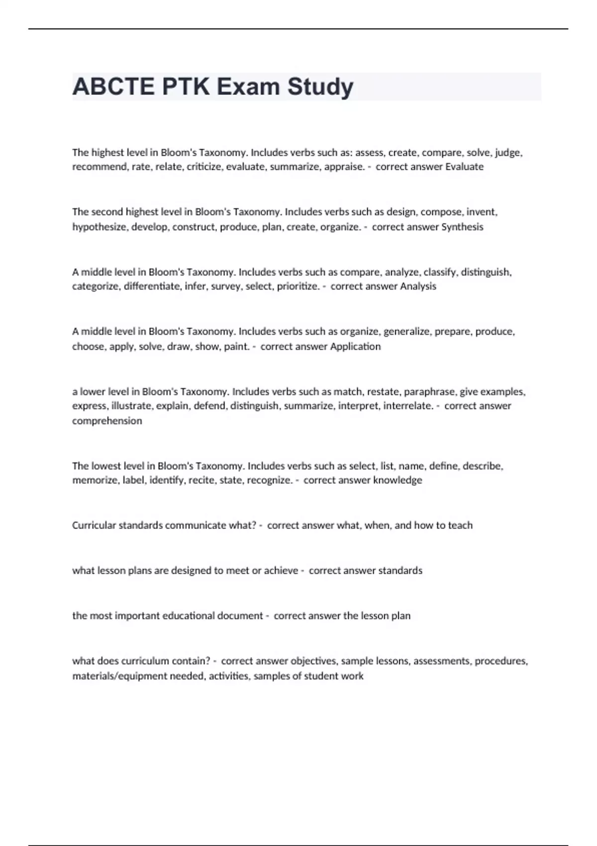 ABCTE PTK Exam StudyThe highest level in Bloom's Taxonomy. Includes verbs such as: assess, create, compare, solve, judge, recommend, rate, relate, criticize, evaluate, summarize, appraise. - correct answer Evaluate The second highest level in Bloom's Taxonomy. Includes verbs such as design, compose, invent, hypothesize, develop, construct, produce, plan, create, organize. - correct answer Synthesis A middle level in Bloom's Taxonomy. Includes verbs such as compare, analyze, classify, distinguish, categorize, differentiate, infer, survey, select, prioritize. - correct answer Analysis A middle level in Bloom's Taxonomy. Includes verbs such as organize, generalize, prepare, produce, choose, apply, solve, draw, show, paint. - correct answer Application a lower level in Bloom's Taxonomy. Includes verbs such as match, restate, paraphrase, give examples, express, illustrate, explain, defend, distinguish, summarize, interpret, interrelate. - correct answer comprehension The lowest level in Bloom's Taxonomy. Includes verbs such as select, list, name, define, describe, memorize, label, identify, recite, state, recognize. - correct answer knowledge Curricular standards communicate what? - correct answer what, when, and how to teach what lesson plans are designed to meet or achieve - correct answer standards the most important educational document - correct answer the lesson plan what does curriculum contain? - correct answer objectives, sample lessons, assessments, procedures, materials/equipment needed, activities, samples of student work what the student is supposed to learn - correct answer objective methods of determining effectiveness of the lessons - correct answer assessments What was the purpose of No Child Left Behind and the Every Student Succeeds Act? - correct answer to create a standardized curriculum for each subject area what is curriculum? - correct answer what the students are supposed to learn as a result of a specific educational sequence of events anchor papers - correct answer the reference for all other work; what is expected by students Who can help translate curriculum? - correct answer administrators and content specialists order the steps of instruction: re-design, teach, repeat, review, give assessment, write assessment, identify time limit of unit, evaluate instruction, review for assessment - correct answer 1. identify time limit of unit 2. write assessment 3. teach 4. review for assessment 5. give assessment 6. evaluate instruction 7. re-design 8. repeat Objectives should be specific enough that they can be used as ____________ questions. - correct answer Exam Lesson Objectives: what the students will ___________________ by the end of the lesson. - correct answer accomplish