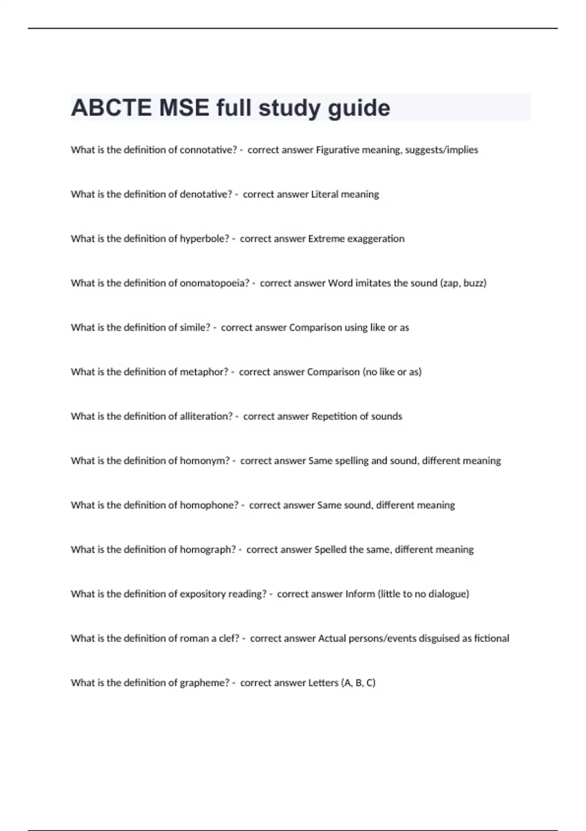 ABCTE MSE full study guideWhat is the definition of connotative? - correct answer Figurative meaning, suggests/implies What is the definition of denotative? - correct answer Literal meaning What is the definition of hyperbole? - correct answer Extreme exaggeration What is the definition of onomatopoeia? - correct answer Word imitates the sound (zap, buzz) What is the definition of simile? - correct answer Comparison using like or as What is the definition of metaphor? - correct answer Comparison (no like or as) What is the definition of alliteration? - correct answer Repetition of sounds What is the definition of homonym? - correct answer Same spelling and sound, different meaning What is the definition of homophone? - correct answer Same sound, different meaning What is the definition of homograph? - correct answer Spelled the same, different meaning What is the definition of expository reading? - correct answer Inform (little to no dialogue) What is the definition of roman a clef? - correct answer Actual persons/events disguised as fictional What is the definition of grapheme? - correct answer Letters (A, B, C)