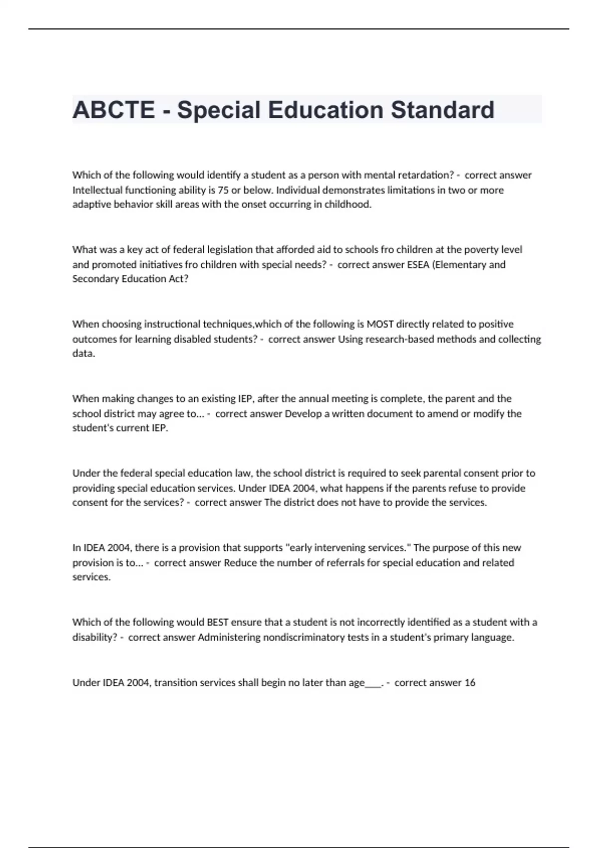 ABCTE - Special Education Standard Which of the following would identify a student as a person with mental retardation? - correct answer Intellectual functioning ability is 75 or below. Individual demonstrates limitations in two or more adaptive behavior skill areas with the onset occurring in childhood. What was a key act of federal legislation that afforded aid to schools fro children at the poverty level and promoted initiatives fro children with special needs? - correct answer ESEA (Elementary and Secondary Education Act? When choosing instructional techniques,which of the following is MOST directly related to positive outcomes for learning disabled students? - correct answer Using research-based methods and collecting data. When making changes to an existing IEP, after the annual meeting is complete, the parent and the school district may agree to... - correct answer Develop a written document to amend or modify the student's current IEP. Under the federal special education law, the school district is required to seek parental consent prior to providing special education services. Under IDEA 2004, what happens if the parents refuse to provide consent for the services? - correct answer The district does not have to provide the services. In IDEA 2004, there is a provision that supports "early intervening services." The purpose of this new provision is to... - correct answer Reduce the number of referrals for special education and related services. Which of the following would BEST ensure that a student is not incorrectly identified as a student with a disability? - correct answer Administering nondiscriminatory tests in a student's primary language. Under IDEA 2004, transition services shall begin no later than age___. - correct answer 16