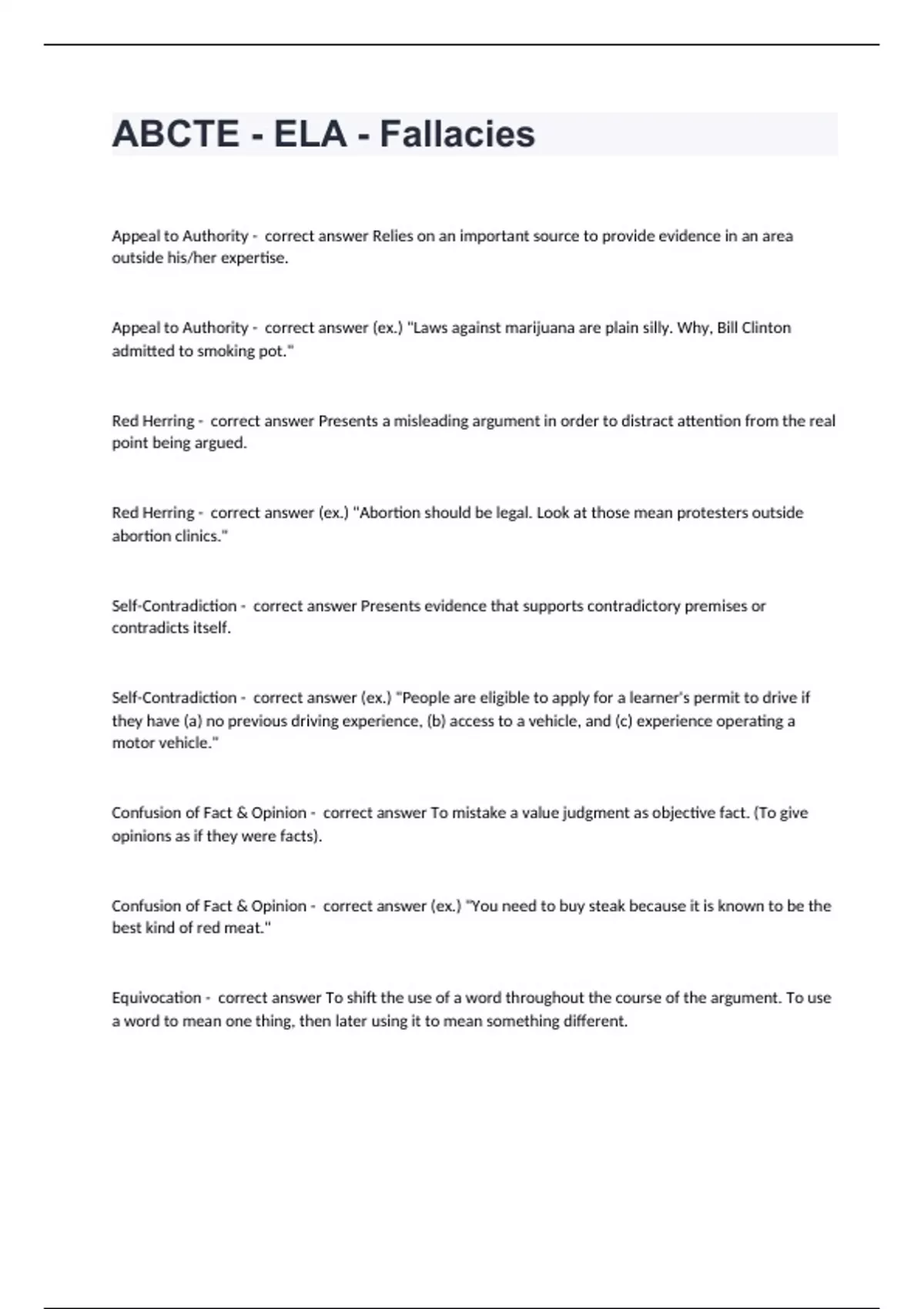 ABCTE - ELA - Fallacies questions with answers 2024