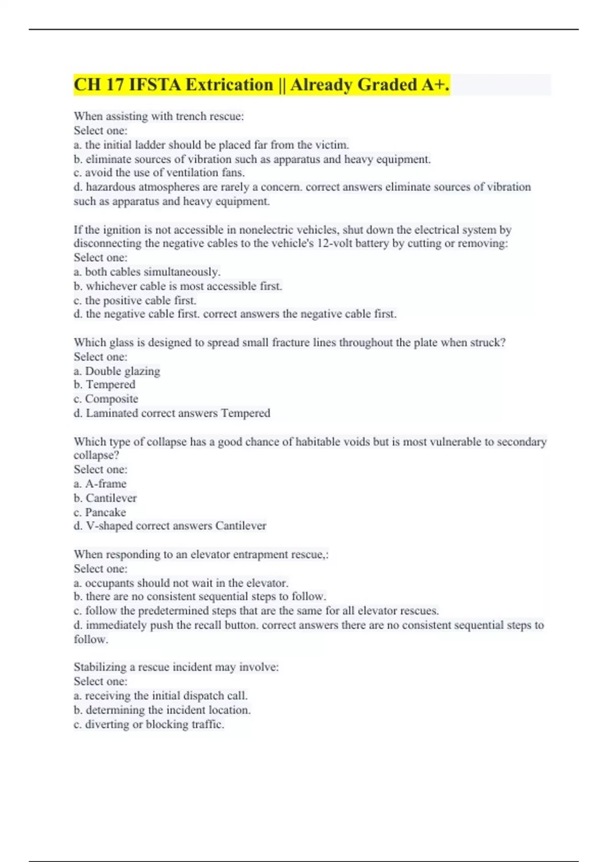 When assisting with trench rescue: Select one: a. the initial ladder should be placed far from the victim. b. eliminate sources of vibration such as apparatus and heavy equipment. c. avoid the use of ventilation fans. d. hazardous atmospheres are rarely a concern. correct answers eliminate sources of vibration such as apparatus and heavy equipment. If the ignition is not accessible in nonelectric vehicles, shut down the electrical system by disconnecting the negative cables to the vehicle's 12-volt battery by cutting or removing: Select one: a. both cables simultaneously. b. whichever cable is most accessible first. c. the positive cable first. d. the negative cable first. correct answers the negative cable first. Which glass is designed to spread small fracture lines throughout the plate when struck? Select one: a. Double glazing b. Tempered c. Composite d. Laminated correct answers Tempered Which type of collapse has a good chance of habitable voids but is most vulnerable to secondary collapse? Select one: a. A-frame b. Cantilever c. Pancake d. V-shaped correct answers Cantilever When responding to an elevator entrapment rescue,: Select one: a. occupants should not wait in the elevator. b. there are no consistent sequential steps to follow. c. follow the predetermined steps that are the same for all elevator rescues. d. immediately push the recall button. correct answers there are no consistent sequential steps to follow. Stabilizing a rescue incident may involve: Select one: a. receiving the initial dispatch call. b. determining the incident location. c. diverting or blocking traffic.